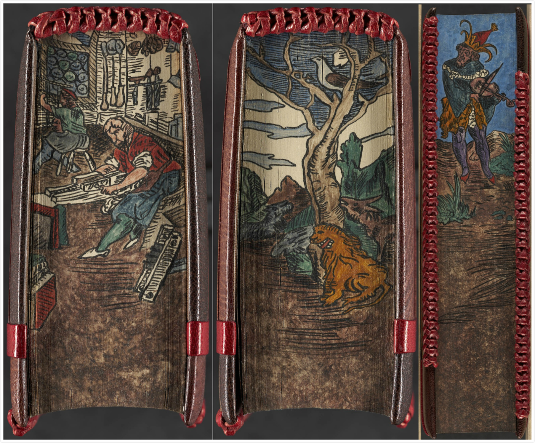 图4 《海涅诗选》(Hans Sachsens Ausgewahlte Werke),波士顿公共图书馆藏,年代不详。上、下书口、前书口上都有直画式书口画,分别画着作坊里工作的男女、围坐大树的动物、拉小提琴的小丑。三幅画作亦可视为全景式书口画。