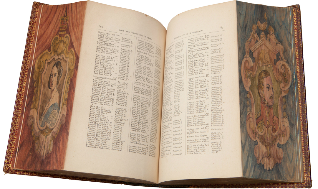 图3 1878年版《德布雷特英国贵族年鉴》(Debrett's Peerage, Baronetage, Knightage, and Titles of Courtesy),分立式书口画,一侧为维多利亚女王,一侧为利奥波德亲王。