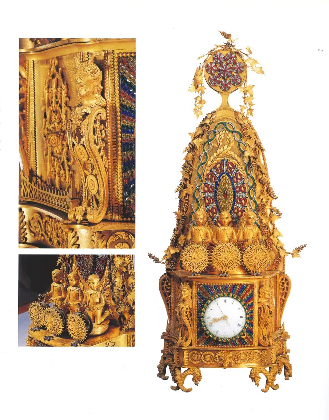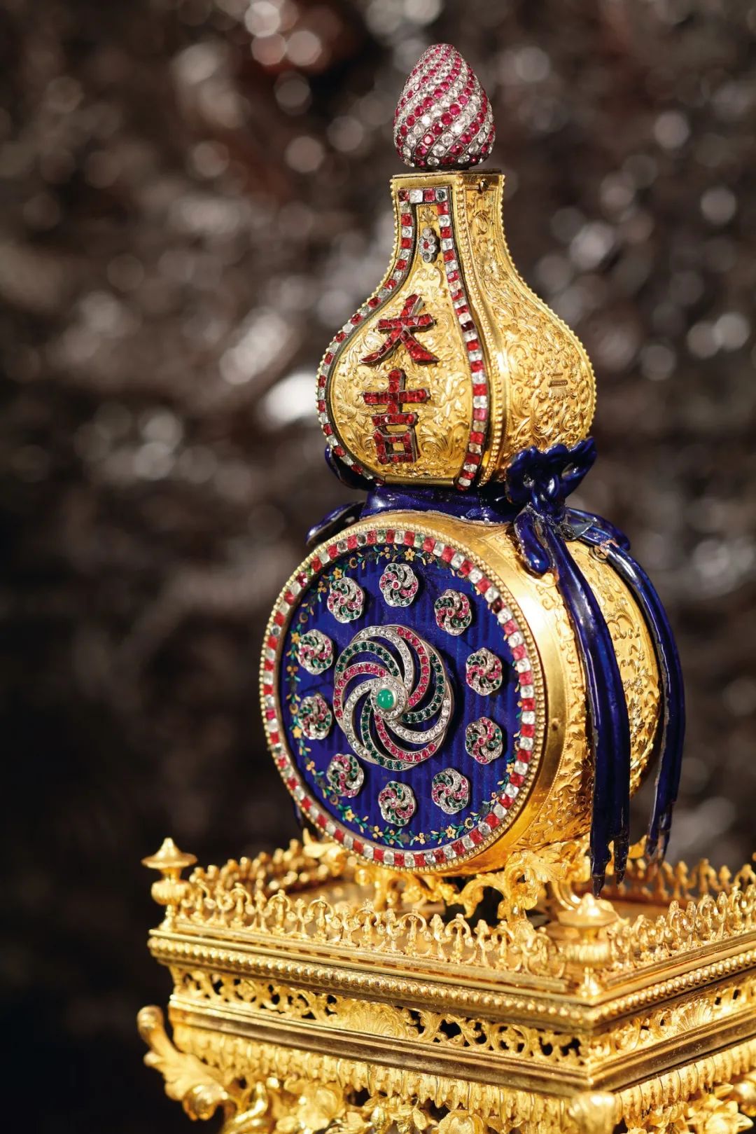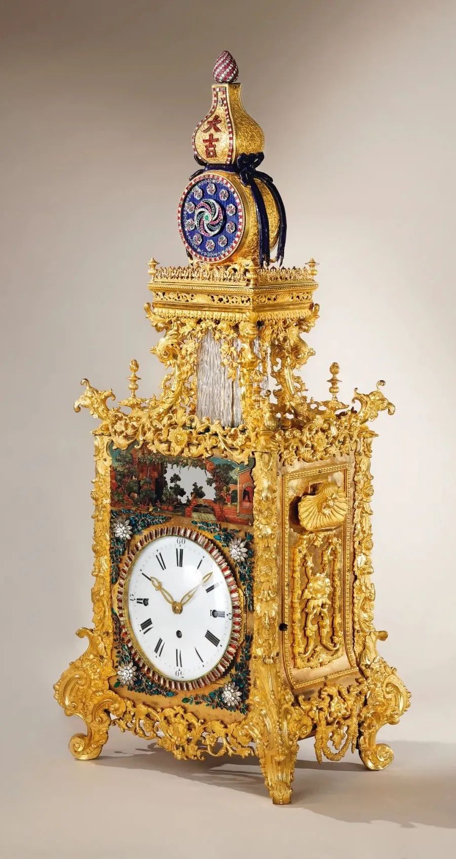 无论是艺术造诣还是技术水准,【清乾隆 御制铜鎏金转花转水法大吉葫芦钟】都体现了乾隆时期广州贡御钟表的最高水平。此钟之造型设计和装饰,采用了中国传统的透明珐琅工艺,料石镶嵌工艺和具有浓郁西洋风格的金属雕刻工艺,中西两种不同的艺术风格巧妙地融合在一起,极具观赏价值。这种东西方的兼容还在钟表的内部有所体现,钟表机芯产自英国,质量上乘。18世纪的顶尖机械技艺与卓越的造型艺术相得益彰,实属难得。清乾隆 御制铜鎏金转花转水法大吉葫芦钟