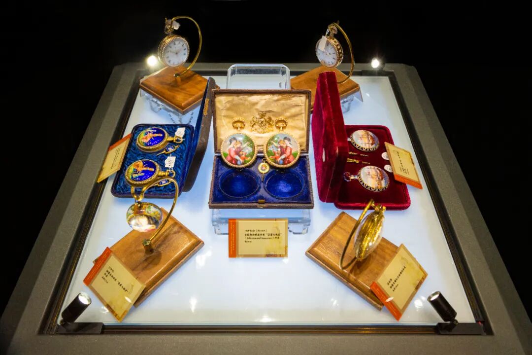 在清宫收藏的欧洲进贡佳品中,亦有小巧精美的怀表佳品。如本次展览的【清乾隆 铜鎏金镶红白玻璃钻怀表】、【清嘉庆金胎画珐琅“温馨与纯真”(Affection and Innocenc镶珍珠对表】,为十八世纪至十九世纪初“宫廷怀表”及“中国市场表”之代表作。