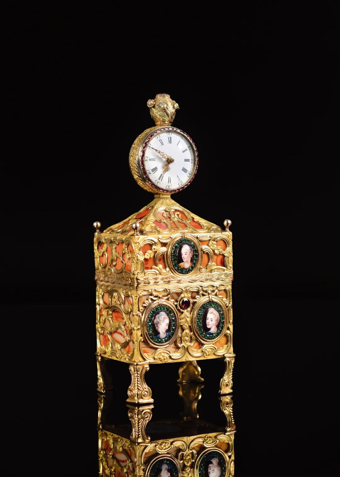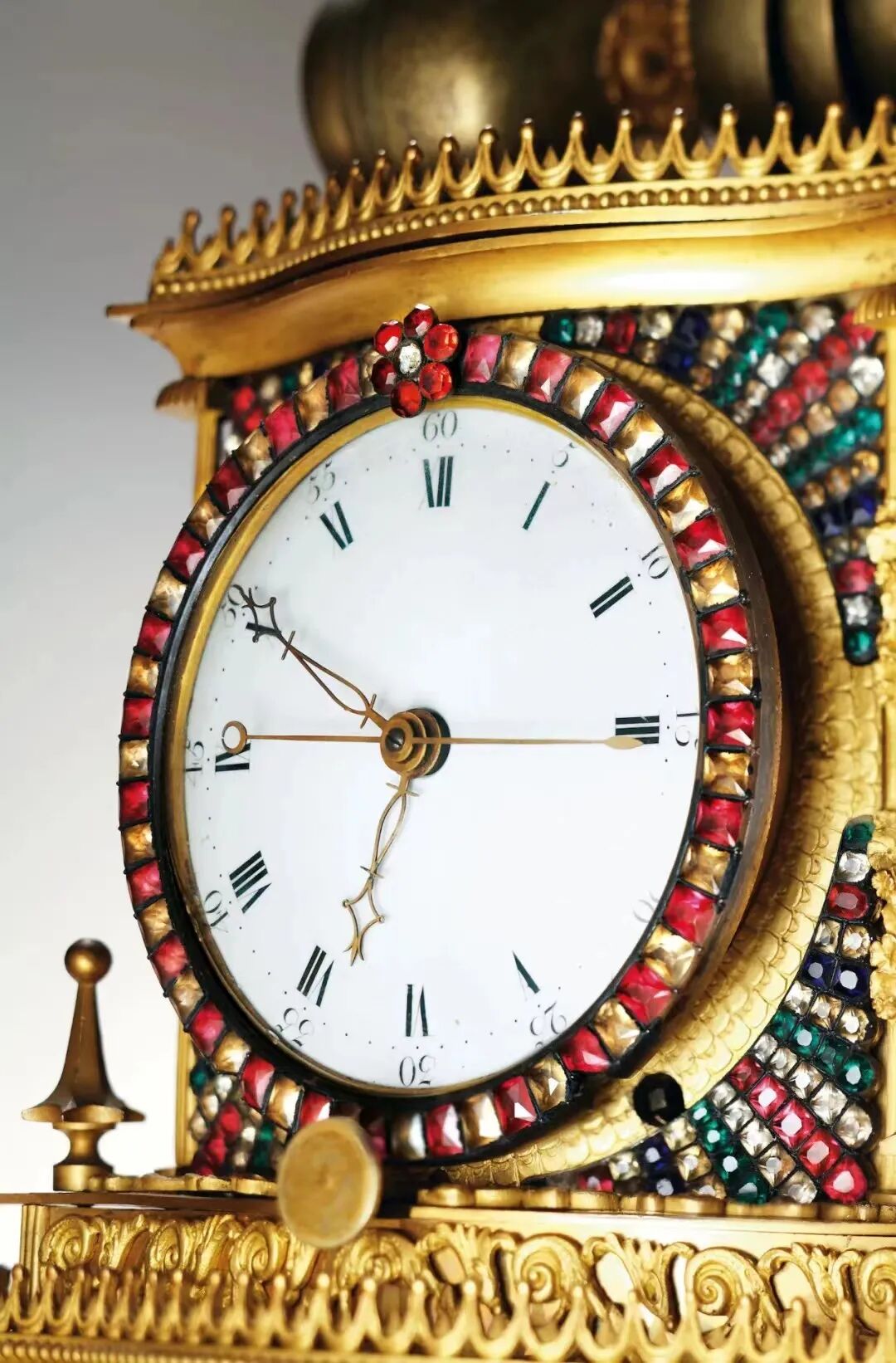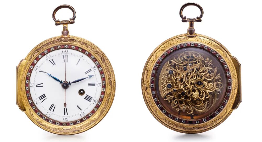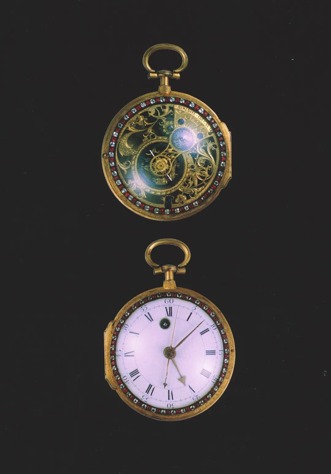 考察“宫廷表”大致以1810年为时间节点,此前的英国表多以雕花铜鎏金外壳镶嵌料石作为装饰,表壳直径通常超过65毫米,而以镂空机芯为罕见的款式,此次展品中的“铜鎏金镶红白玻璃钻怀表”即为一例(目前已知北京故宫和沈阳故宫的著录中仅有三只)。