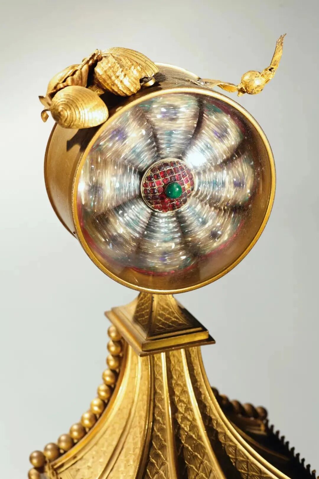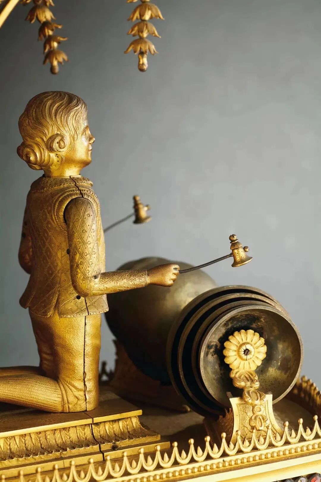 特展第三章“清宫钟表”,明星展品包括【清乾隆 御制铜鎏金转花转水法大吉葫芦钟】、【18世纪铜鎏金太平有象水法转花音乐自鸣钟】、【清乾隆-嘉庆 铜鎏金御题诗西洋游戏人物钟】、【清乾隆 铜鎏金转花西洋童子打乐钟】等,旨在聚焦欧洲为中国宫廷特制的钟表作品和中国宫廷自制中西结合钟表,由此探究西方世界打开中国的努力与来自中国皇权态度的互动关系。清乾隆 御制铜鎏金转花转水法大吉葫芦钟(局部)