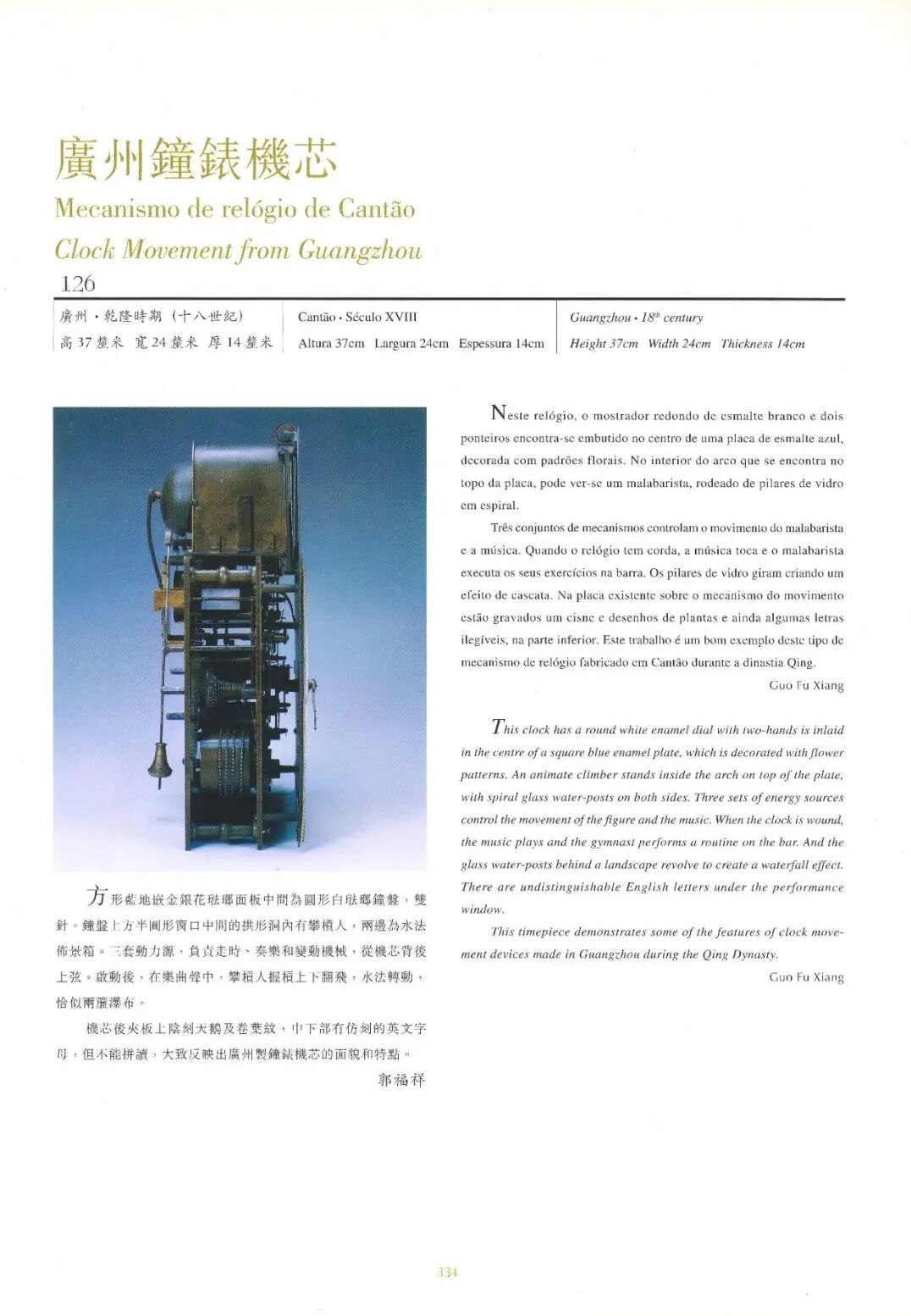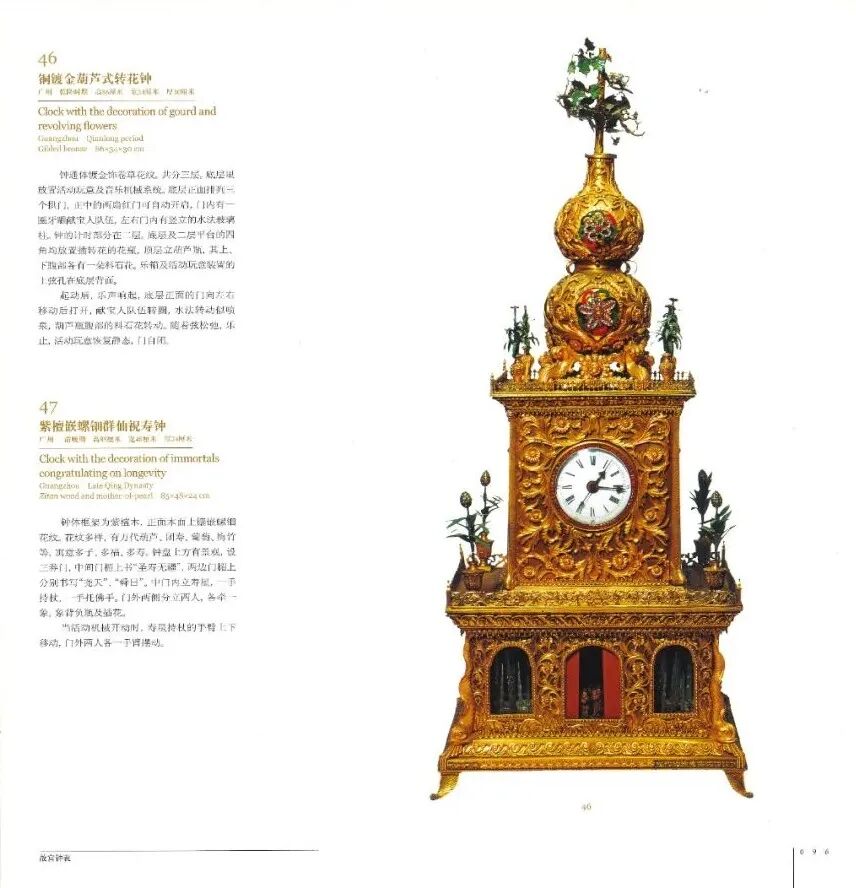 此钟为非常稀有的小尺寸极品广钟,根据钟盘上写有嘉庆帝即位前所作的诗句,初步判断为清帝身边的近物,并放置于书房供赏玩。整体分为钟壳和底座两层,钟壳顶部显眼处为一个攀杠的西洋人偶,钟壳周身被“广珐琅”覆盖(带有葫芦形窗)。底座采用铜鎏金工艺,与珐琅质感形成鲜明对比,独树一帜、实为罕见。赏心悦目之处在于整点报时,钟壳和底座内水法齐转,犹如瀑布涌出。大小不一的转花同时旋转,酷似缤纷群芳。最为讨喜的西洋人偶也上下攀杠运行,颇具外夷取悦龙颜之意。