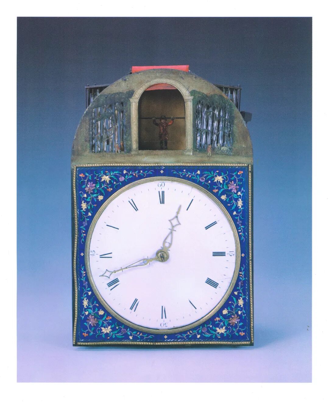 明清鼎革,清圣祖玄烨(康熙皇帝)通过“历法之争”,认识到西方历法的准确性,因而对西学充满兴趣并进行系统学习。“凡侯时皆准以昼夜,周日十二时,时八刻,刻十五分,分六十秒”明确写入《钦定大清会典》,并作为有清一代的时间制度。遵循此种制度,从康熙朝开始“御制”钟表之风逐步兴起。清高宗弘历(乾隆皇帝)更将此风潮推向极致,不仅在清宫内自制钟表,也通过粤海关机构向西方采买各类钟表。由此展开了“宫廷钟表”专项庋藏的绚丽画卷。