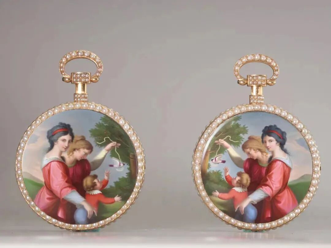 此后的瑞士表则以金壳搭配画珐琅装饰为主,尤以珐琅师Jean Abraham Lissignol的表款引人入胜。此次展品中一对“金胎画珐琅嵌珍珠‘温馨与纯真’怀表”就出自他手,相传为英国乔治三世国王着阿美士德使团进献嘉庆帝的礼物,表盒包以小羊皮质,内部烫金乔治三世国王皇室印记以为佐证。1919年瑞士出版的《中国表》(法文版)第78页著录一款产自日内瓦的珐琅表,其珐琅图案与此次展品基本一致,代表了当时进入中国市场极高等级的瑞士表。![]()