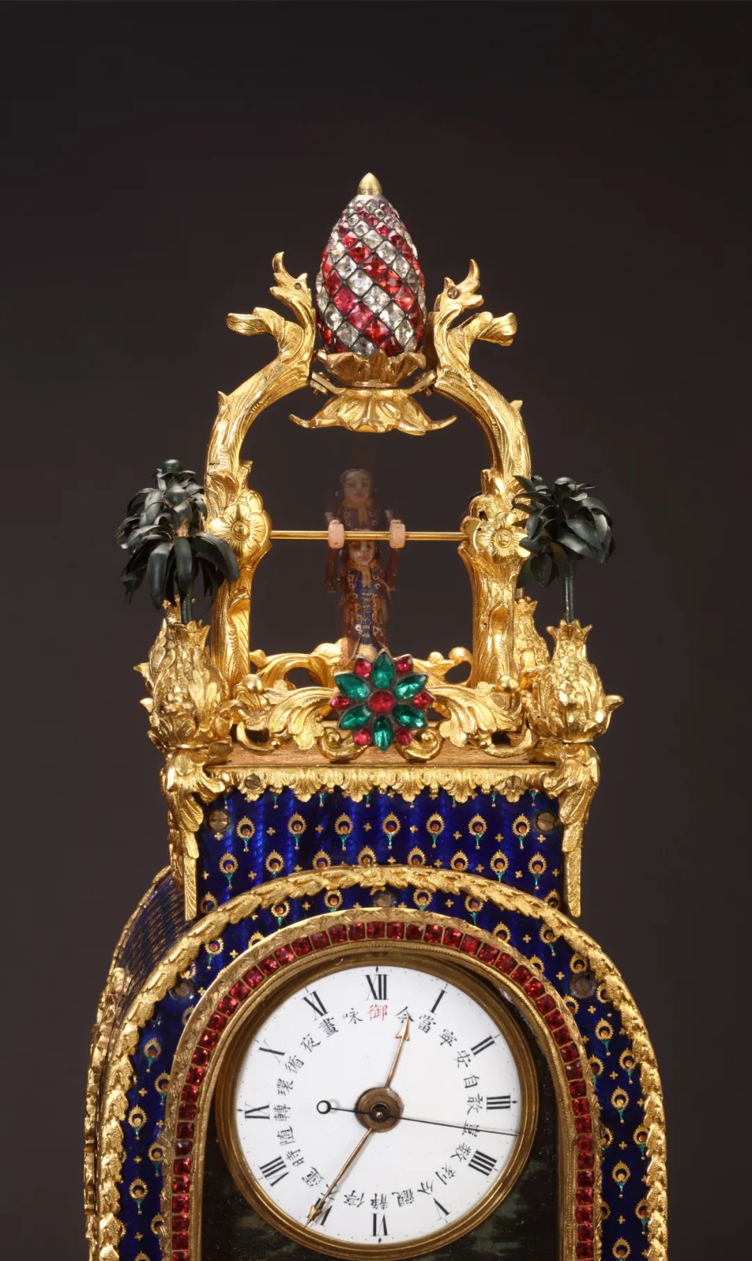 钟分三层,下层布景箱内居中是一朵旋转宝石小花,两侧紧密直立的玻璃柱组成水法景观。中层安置表盘,表盘其下饰水法,其外的钟壳则饰以蓝地珐琅彩彩绘,纹饰呈“孔雀羽”的造型,这在同类作品中不为常见。座钟上层饰活动翻杠西洋小人,颇具西洋情调。启动时,座钟有乐声叮当作响,伴以玻璃水法似瀑布般流动,宝石花卉绚丽旋转,翻杠小人上下翩然起舞,气氛欢乐,极具意趣。清乾隆-嘉庆 铜鎏金御题诗西洋游戏人物钟 御题诗