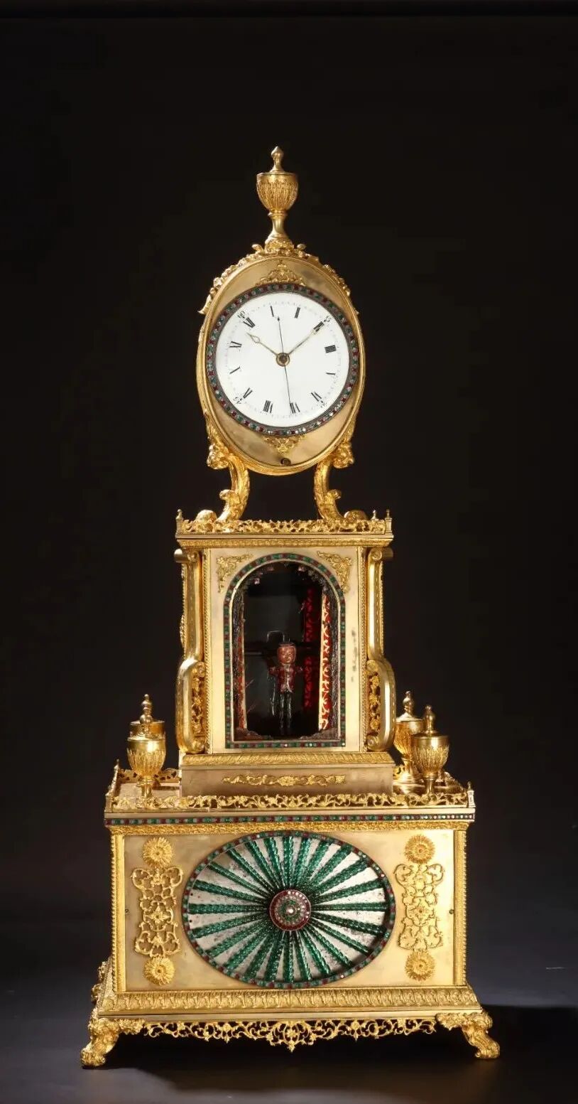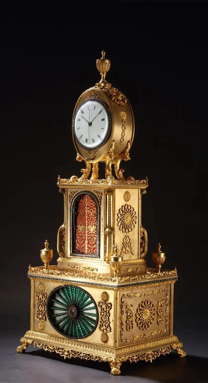 整体分为三层。长方形的底层由四个卷叶足支撑,中间具有椭圆形的开光,其中有绿色的水法,以放射状安装而成。边框镶嵌有红色、绿色和白色料石。上方的四角具有新古典主义风格的瓶形。中层采用凸出的平台,其侧面采用贴花设计,与底层的工艺相匹配。正面有一个拱形设计,带有两扇滑动的丝质背面镂花门。开门时会显示出一个彩绘精美的杂技人偶。上层为椭圆形设计并装有时钟盘面,并且由四个卷叶足高高托起。