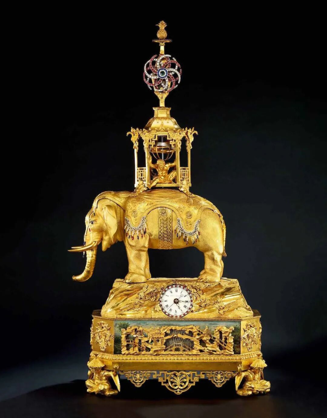 “太平有象”的寓意在18世纪盛清宫廷艺术中占有重要的地位。其代表王权与礼仪的象征性,被西方尤其是英国钟表师表现的淋漓尽致。从乾隆三十二年陈设“铜镀金象驮四面表”(现藏于北京故宫)开始,“太平有象”的主题便成为“宫廷钟表”中款式既丰富又自成一体的御用珍玩。此钟堪称奇伟之作,走时、报时、奏乐、水法、转花以及自动机械大象表演,无一不具备。除了大象造型作为视觉重心之外,其他装饰细节更是兼具中西元素。既在底座处演绎欧洲“中国风”(Chinoiserie )的园林设计,又在上部亭内安置希腊神话人物雕塑。与此钟异曲同工之作,可参考英国沃德斯登庄园的自动机械大象(没有钟表显示)。此钟的钟盘署名Peter Torckler(1748-1824),为1780年代初在伦敦工作的钟表师,其作品也被叶卡捷琳娜二世拥有,现收藏于圣彼得堡hermitage博物馆。