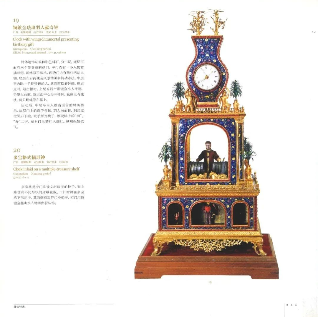 “广钟”(即广州地区制造的时钟)是盛清时期极为重要的中国钟。根据学者最新的研究指出:广钟可分为三类:一是极品广钟,大部分作为贡品被官员订购后进入清宫;二是作为市场供应的精品广钟;三是普品广钟。收藏于北京故宫的广钟多带有复杂炫目的动偶装置,除了走时、报时功能之外,具有非常强的娱乐性和观赏性。![]()