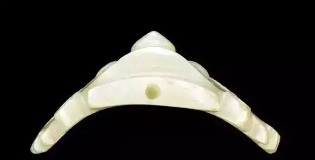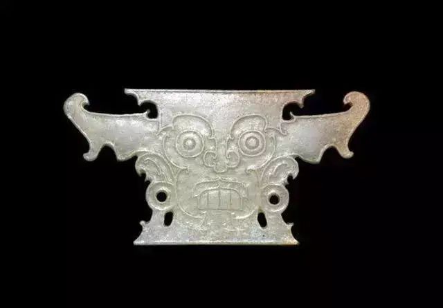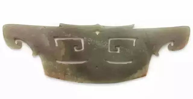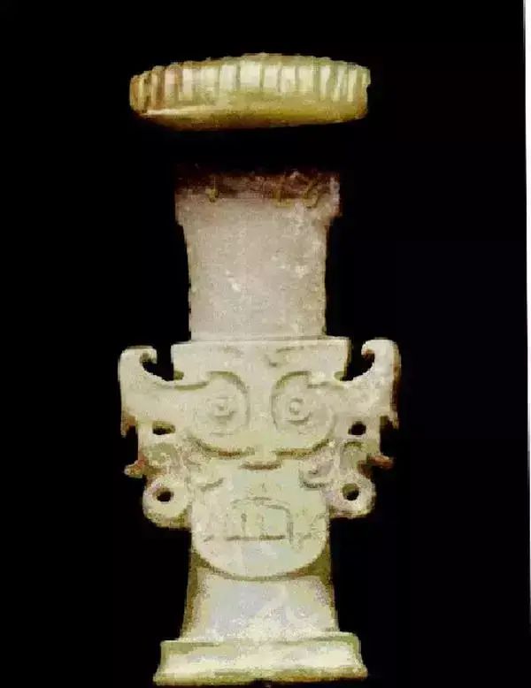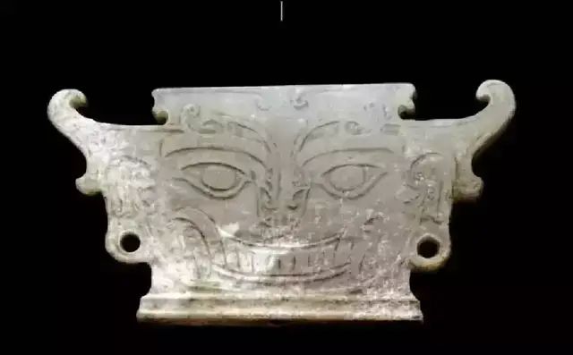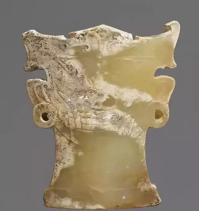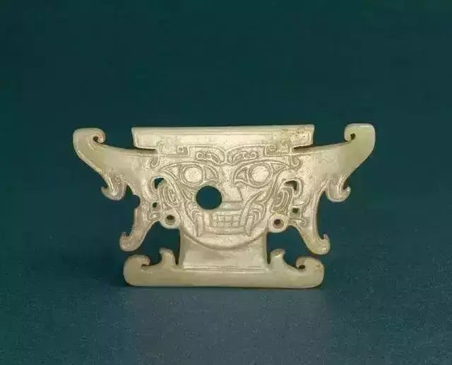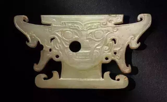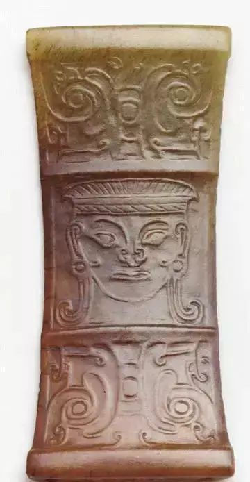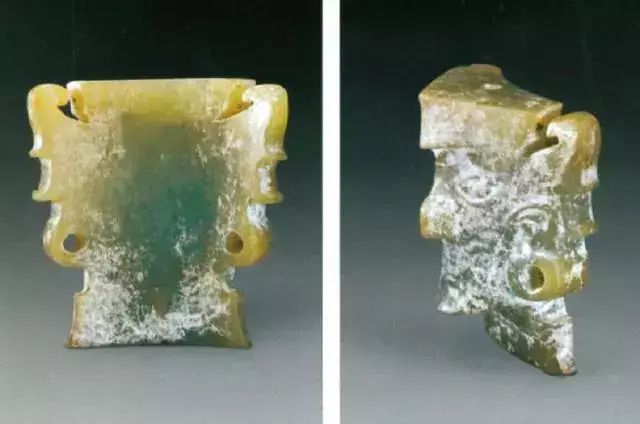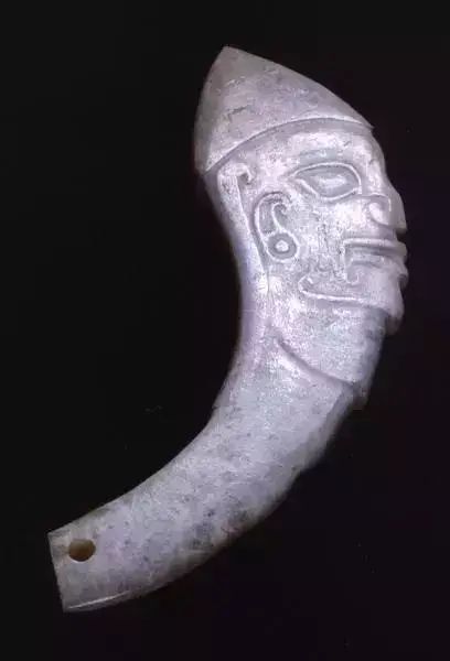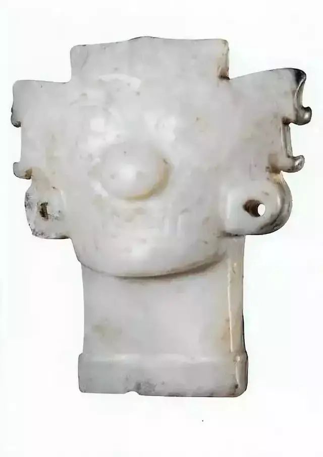 上图为石家河文化人头形玉饰,肖家屋脊出土,青黄色玉质,表面有乳白色斑,人头像雕刻于一块玉戈上,以玉戈外缘为轴将人面一分为二分刻于玉戈两面。