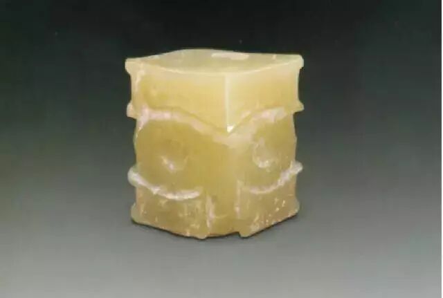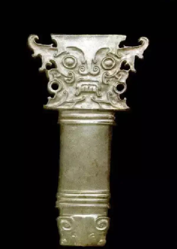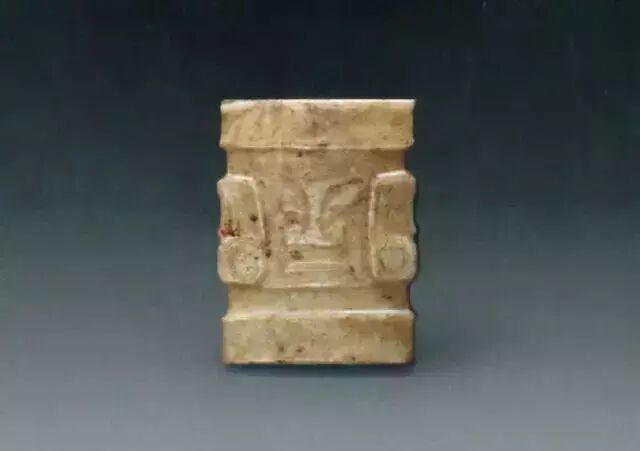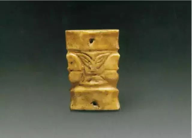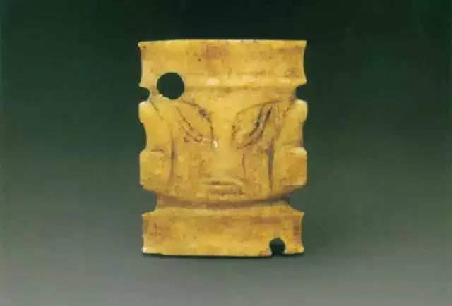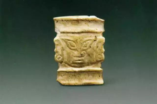 上图为石家河文化人头形玉坠,肖家屋脊出土,青黄色玉质,表面有灰绿色沁斑,在一根玉管表面浮雕出人头像。