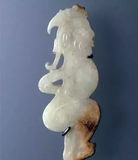 上图为石家河文化玉人头像,肖家屋脊出土,黄绿色玉质,表面有乳白色斑点。