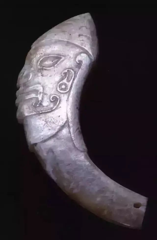 上图为石家河文化玉人头像,谭家岭出土,青玉质,五官清晰、匀称,耳朵为一对飞鸟,耳垂部穿孔,口中露出两排牙齿,口角有上下两对獠牙。