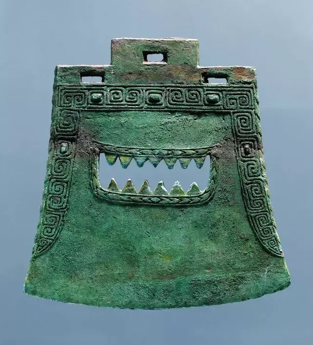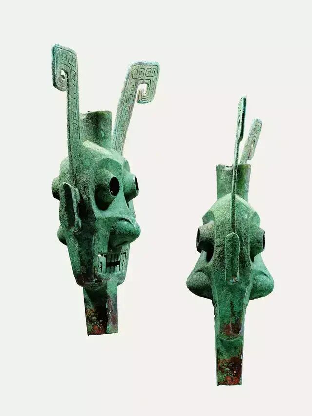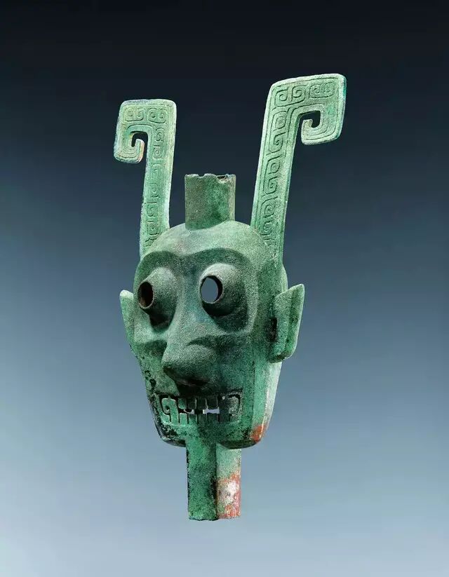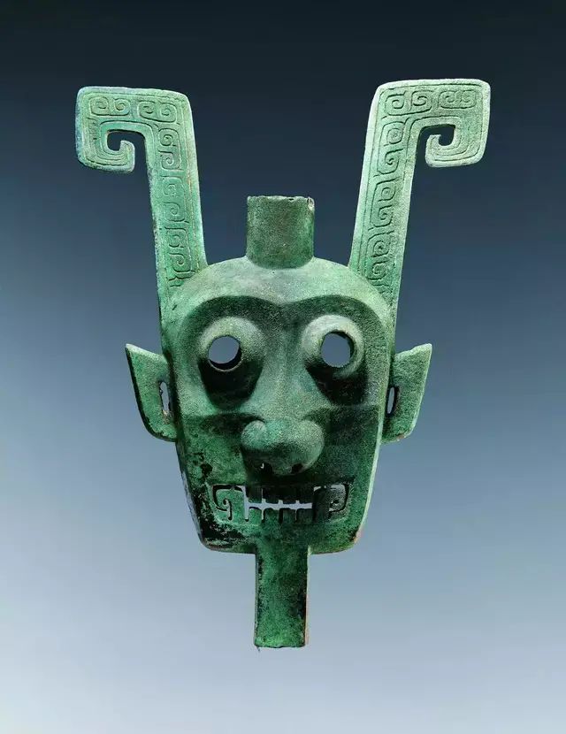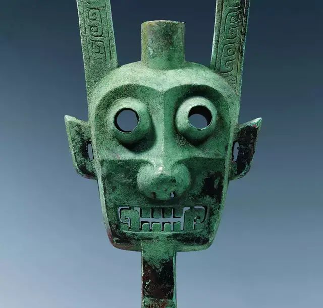 中空扁平双面人首造型,两面相同对称,额部宽,颌部窄,呈倒置的等腰梯形。眼窝下凹,眼球圆凸,内开圆洞。嘴张齿露,中齿铲形,侧牙勾卷。旁安两耳,顶插双角。上管下銎,管銎相通。顶上圆管可插羽冠,下部方銎能装木柄。面容神秘诡异,威严恐惧。上管圆、下銎方的造型和古人天圆地方的理念相通,寓意神人贯通天地的能力。
