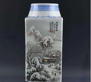 何许人1882-1940,原名处,字德达,乳名花子,安徽南陵人,何许人早年从安徽南陵来景德镇学画青花,1920年受詹氏昆仲相邀到北京临摹古画,为瓷器青花寻找仿古画面,一次在八旗子弟家见一幅水墨雪景山水的启发, 认为在瓷器上用墨料打底,用陶瓷颜料雪白形成黑白分明的效果,加上雪的厚度真正形成雪景的肌体效果,回到景德镇后,便联合詹氏兄弟完成了雪景山水的创作。不久,他加入珠山八友,1931年到九江开瓷器店,麾下收了邓肖禹、龚耀庭等花鸟山水大家。“昔年釉里画青花,今已成名雪景家。仿古惟君称独手,南来北往走天涯。”王大凡对何许人给予了很高的评价,而何许人在中国山水绘画史上,也是开雪景山水之新风的艺术大家。