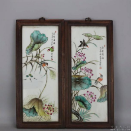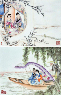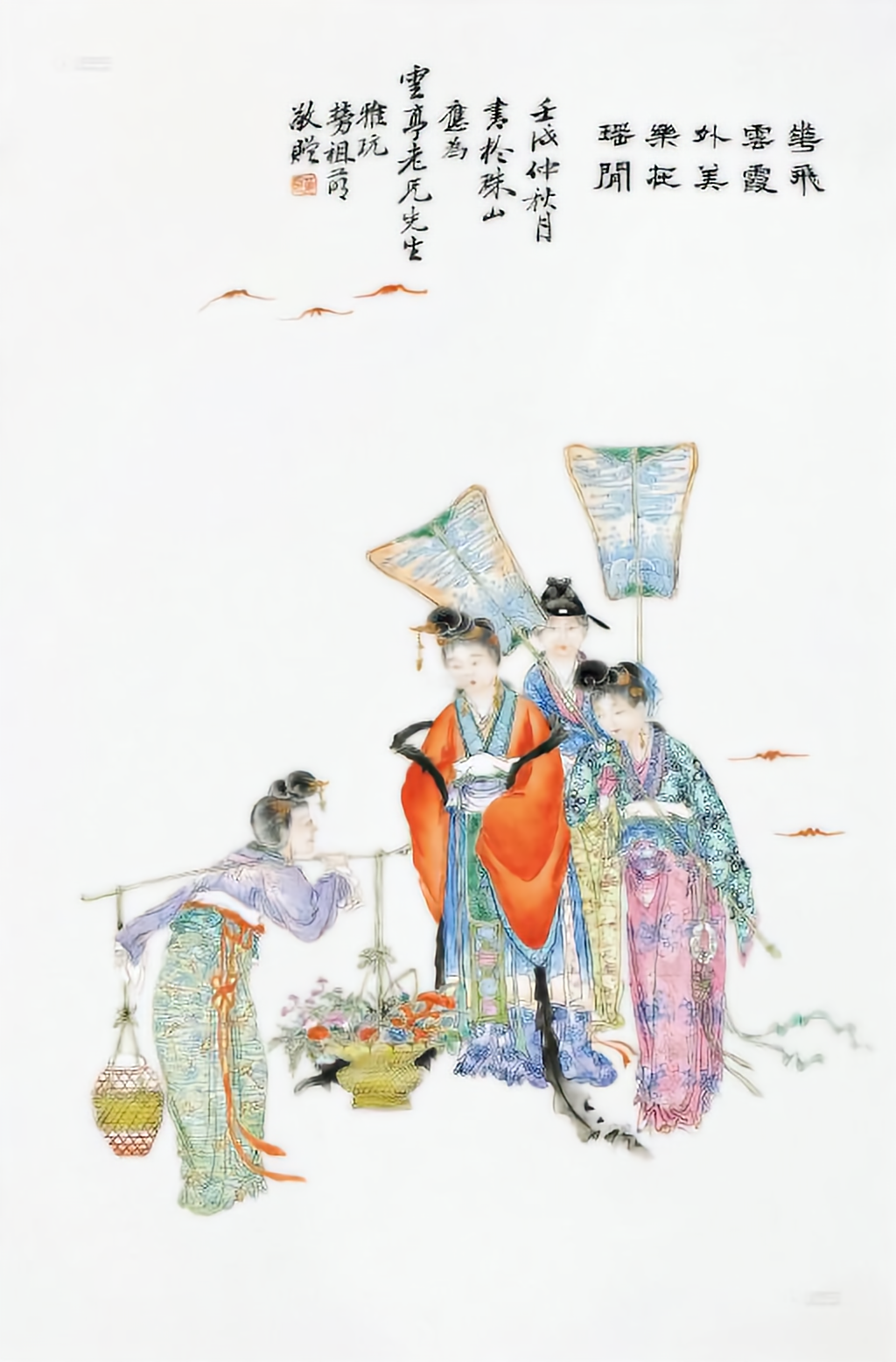 浅绛彩在中国瓷器上第一次以文人画的形式出现,如程门的《素山秋风》瓷板“四郭青山处处同,客怀无寄答秋风”,他的《溪锁绿野》题诗“一溪深锁绿烟斜,两岸浓郁获落霞”,都达到了诗中有画,画中有诗的效果,如王少维的红叶题诗,直接点题,开宗明义。如金品卿的杜牧诗意《南陵道中》“正是客心孤同处,谁家红袖凭江楼”,把一位客居他乡,心情郁闷的人,突然看见一位独孤的少女正在江边的窗口或观赏秋天的美景或思念远方的恋人,把人生离愁别绪表达淋漓尽致。