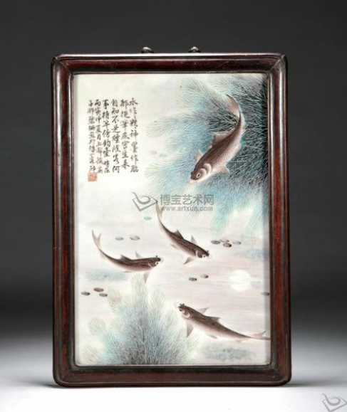 邓碧珊1874-1930,江西余干人,字壁寰,号铁肩子。王大凡对他的题诗是:“少壮儒林读圣经,中年昌水创图形,生乎擅作濠梁兴,写幅鱼儿另渭泾”。王大凡对他的评价非常高,读圣贤书,在传承的基础上努力创新,成绩斐然,不仅发明了九宫格画瓷像,而且独创净水留声技法,他画的鱼是静态的,但配以水草则是灵动、空灵,有鱼不动而水动的感觉。