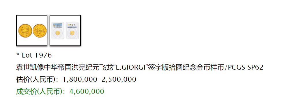 TOP2袁世凯像中华帝国洪宪纪元飞龙“L.GIORGI”签字版拾圆纪念金币样币