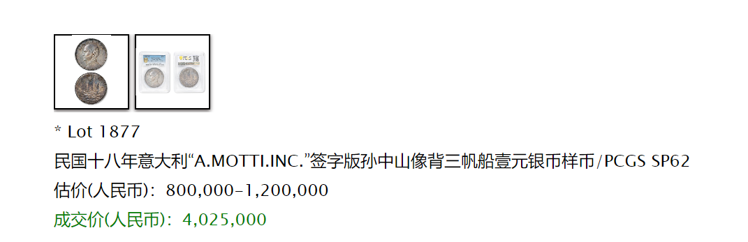 TOP3 民国十八年意大利“A.MOTTI.INC.”签字版孙中山像背三帆船壹元银币样币