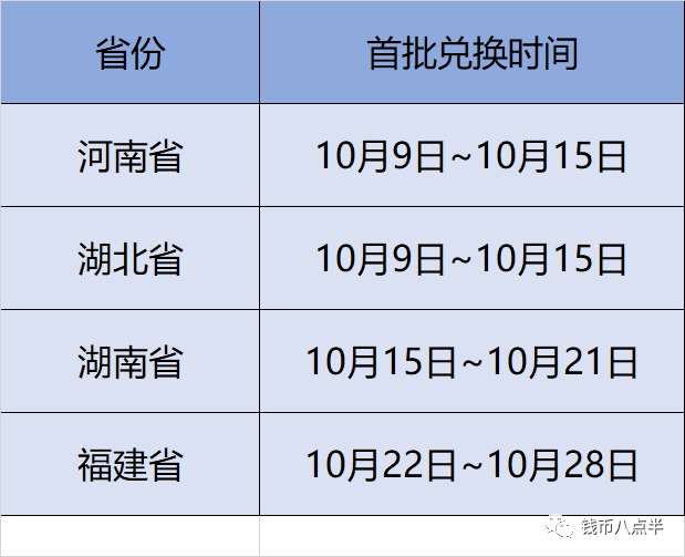 从10月9日开始到10月28日,河南、湖北、湖南、福建这四个地区的建党100周年纪念币首批兑换将陆续开始。