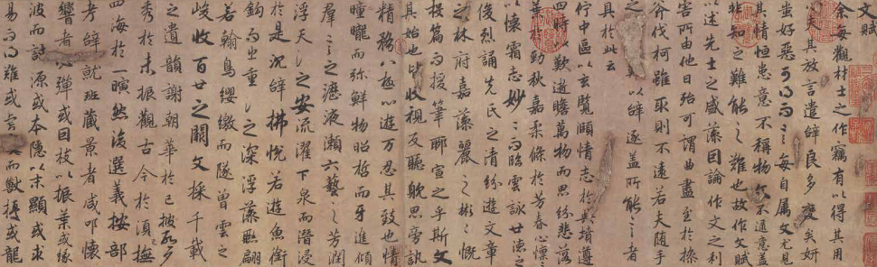 陆柬之,吴郡吴县(今江苏苏州市)人。为东晋名臣陆玩之后,陆玩即是陆机祖父陆逊的侄孙。所书《文赋》为西晋陆机所作,是一篇探讨文学创作的赋文。此卷引首“二陆文翰”为明代书家李东阳题写,强调的正是陆氏家族不同世代对地方文化记忆的塑造。
