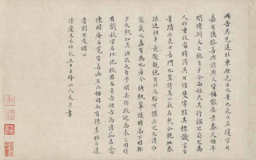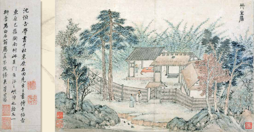 图注:“此吾吴先达杜东原先生之笔也。先生名琼,字用嘉,有隐操,善画诗,与文皆称能,在景泰、天顺年间传斯文之脉……。同时有刘秋官名珏(刘珏)、沈徵君名贞吉(沈贞)、马清痴名愈(马愈)、陈醒庵名宽(陈宽)皆善画,名品相同。而有陈季昭名暹(陈暹)者,则不及诸公。”(文伯仁题)