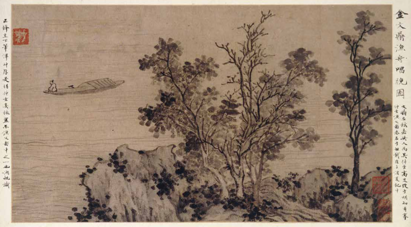 金铉(1360-1436),字文鼎,号尚素,松江人。画风元四家吴镇,与沈周家族三世有交,画史称其开沈周画风之先:“金文鼎,永乐中以绘事名海内,为吾松先辈风流宗师。此卷墨气郁勃,不减胜国时诸大家。至其笔力苍古,便是石田先生门户,孰谓无风气开先之助耶!”
