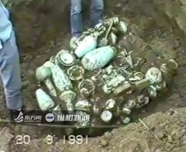 大量的商业需求刺激着陶瓷的生产,负责交易环节的四川商人,便在此时粉墨登场。在贩卖陶瓷这件事上,走南闯北的四川商人非常活跃。蒋祈在《陶记》中曾有记:“江、湖、川、广,器尚青白,出于镇之窑者也。”这些商人从全国各地搜寻上好的瓷器,再将他们运回四川卖掉。彼时,四川正是繁盛的天府之国,而遂宁,则是当之无愧的“东川巨邑”。两宋时期,遂宁一直都是中国西南地区的糖业中心,在地理位置上,遂宁又西接成都、东连巴蜀,是北道上的“东蜀之都会”。在这样的背景下,不少商贾富豪都需经过遂宁运送物资,大量的精美陶瓷涌进了这里。但是这些陶瓷是如何被留下,而后再保存至今,却是同遂宁,以及南宋的衰落有关的。南宋末年,王朝的统治摇摇欲坠。四川由于历代为兵家必争之地,时不时便爆发战争。战乱与冲突毁灭性的冲击着人们的生活,于是在南宋末期,窖藏便成了一种常见的贮藏宝物的手段——许多人在逃亡之际,都会将自己家中的宝物藏于地窖当中。而那些主人未再回来取出的窖藏,便成了我们今天发掘文物的来源。1991年时,金鱼村的几位村民在自家菜地里挖坑,锄头啷当一下,碰到的却是清脆的瓷器声。这几位村民随后上报了政府,几天后,经过文物部门的抢救性发掘,金鱼村出土了近千件宋代瓷器,为目前我国发现的最大的宋代瓷器窖藏。金鱼村窖藏出土现场的影像资料。遂宁金鱼村于1991年出土了一号坑窖藏,2003年出土了二号坑窖藏。一号坑除去大量瓷器还有部分铜器和石器的出土,二号坑文物数量较少,仅出土完整可复原器物47件,包括46件瓷器和1件铜器。图:东方网而在这上千件瓷器当中,大部分的又来源于浙江龙泉窑和江西景德镇窑。来自龙泉窑的主要是青瓷,大部分都是梅子青的釉色,兼有粉青釉和开片。其器形可大致分为两种:一是罐、灯、碗、盘类生活用器;一是仿官窑的瓶、炉、壶类陈设用器。南宋龙泉窑青釉菱口瓜棱瓷瓶,图:四川宋瓷博物馆官网