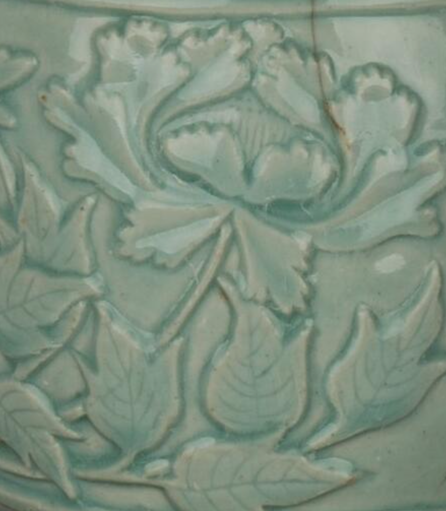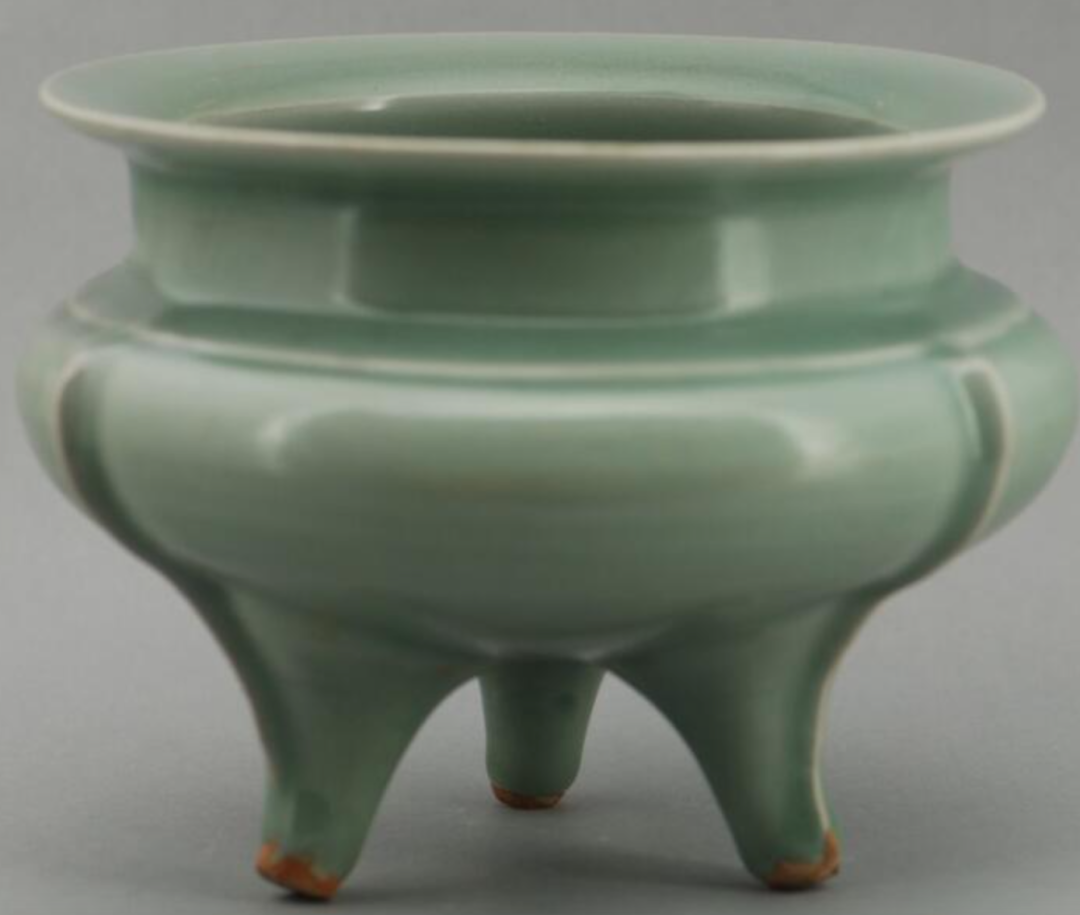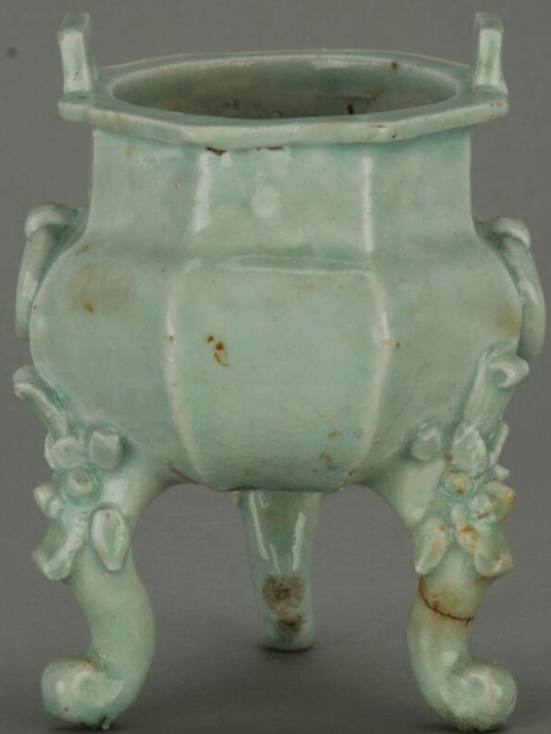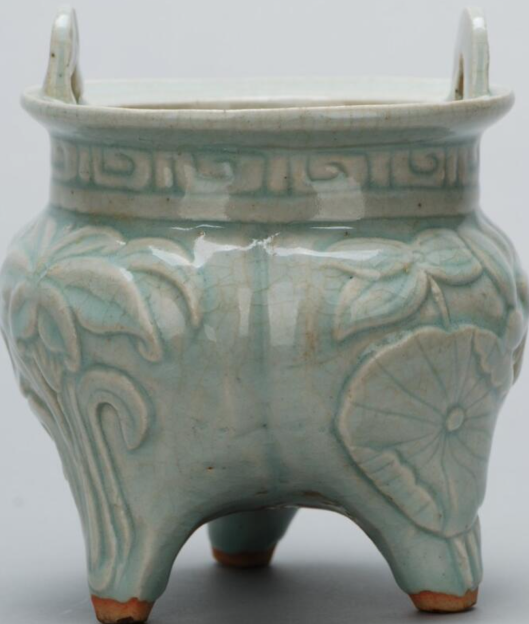 梅瓶由瓶、盖,两部分组合而成,通体施以青白釉色。在雕刻技法上,此瓶使用了刻花与划花相结合的装饰技法,由此带来了纹样疏密有致,釉色也深浅不一的效果。刻在梅瓶上的卷草纺又称卷枝纹,是在忍冬纹的基础上发展而来的。忍冬纹原为西方传入中国的叶状植物纹样,后来形成各种变体,梅瓶上的卷草纹便是一例。这个瓷炉为白胎,施以青白釉色。沿上附一对方形立耳,而腹部饰以一对铺首衔环,三兽足,足上又有堆贴兽头鳞毛,足端外卷。这件瓷炉总体造型呈八棱形,兽足及腹部环耳的装饰极为罕见,且尤为华美,已近似元代鼎式炉。总体来说,这批宋瓷件件都极为精美,釉色莹润而器型古典,向我们传达出那个时代的流行、情感与普遍的审美特征:瓷器清丽的颜色,对应的是宋画中的山水意趣;仿古和简约的造型,凸显的则是宋代社会中流行的复古思潮。瓷器恰到好处的还原着一千年前日常生活的艺术,而观看它们,亦为我们形构出那“一色纯净”的宋代社会的一角。