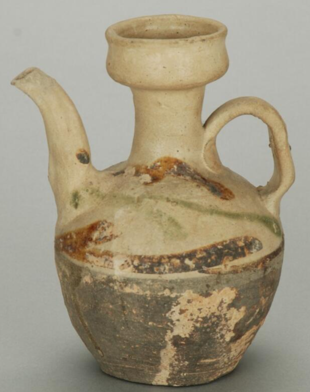 《续通鉴》卷一百七十记载:“宋理宗淳祐二年,蒙古兵破遂宁、沪州”。故学者们推测,这批瓷器很有可能是在淳祐二年(1242年)蒙古兵破遂宁时埋藏的。宋理宗在位时,已进入南宋晚期。但窖藏中发现的景德镇青白瓷刻画花碗,却是流行于北宋后期的。这就将窖藏主人可能生活的时代,又扩大到了整个两宋时代,其行迹难以寻觅。这批瓷器中还有被鉴定为北宋时期的瓷器,例如这件北宋邛窑褐绿彩绘盘口瓷注子,图:四川宋瓷博物馆官网