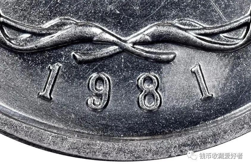 从上图可见,1981的第二个“1”周围的区域看起来与硬币的其他的区域截然不同。有些人的第一感觉就是这块区域被打磨过了。事实上,这枚硬币的年号不是1981年,而是其他80年代的年号。技艺精湛的造假者为了把年号改为稀有的1981年而去掉了年号最后一位数字四周的金属。