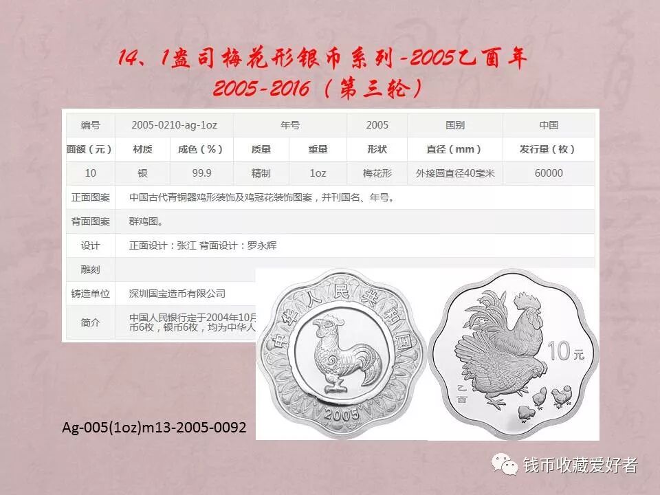 新发银币6种(1盎司梅花形银币(第三轮)-12枚、1盎司圆形银币(第二轮普制改为精制)-8枚、彩色5盎司银币-7枚、1盎司扇形银币(第二轮)-5枚、5盎司长方形银币(第二轮)-5枚、1公斤银币(第二轮)-3枚),共计40枚;