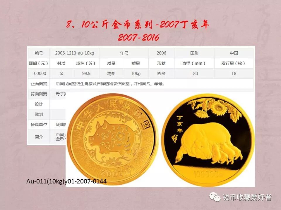 1、金币10种:3克圆形金质纪念币、3克圆形金质彩色纪念币、10克扇形金质纪念币、15克梅花形金质纪念币、150克长方形金质纪念币、150克圆形金质彩色纪念币、500克圆形金质纪念币、1公斤梅花形金质纪念币、2公斤圆形金质纪念币和10公斤圆形金质纪念币。