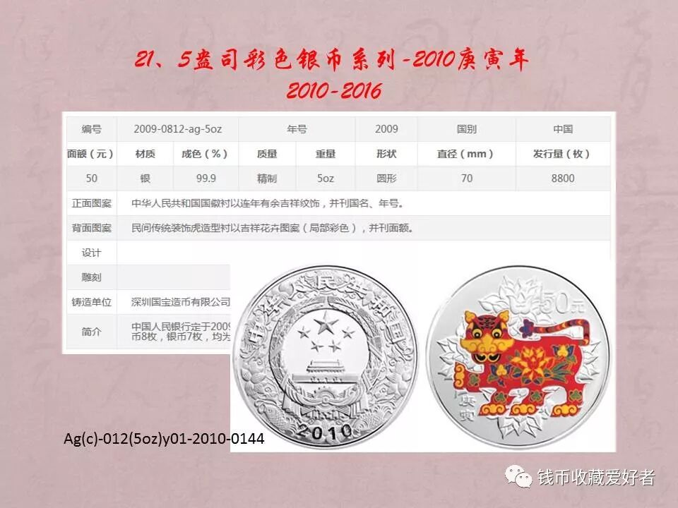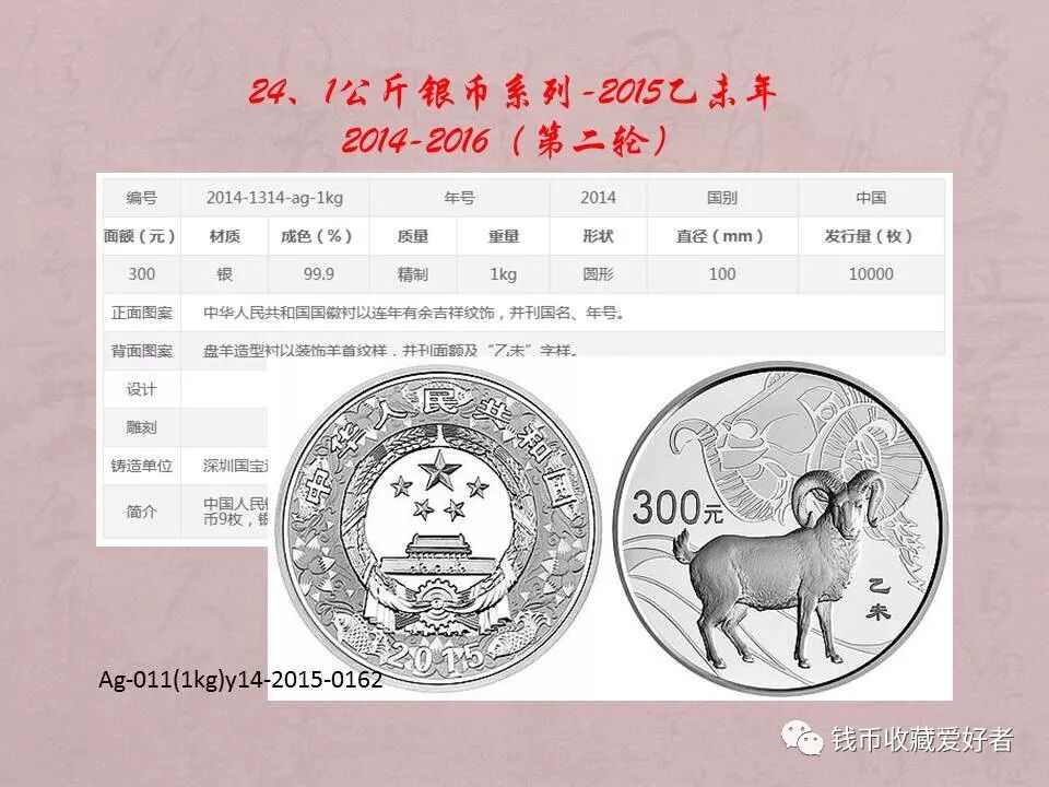 2、银币7种:30克圆形银质纪念币、30克圆形银质彩色纪念币、30克梅花形银质纪念币、30克扇形银质纪念币、150克长方形银质纪念币、150克圆形银质彩色纪念币、1公斤圆形银质纪念币。