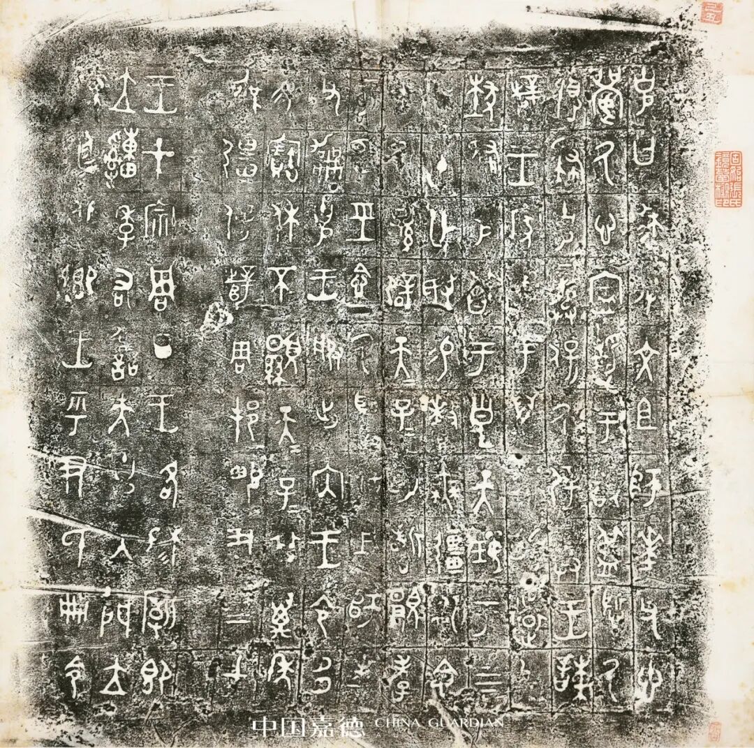 传统金石收藏中碑帖是大宗,除此之外的金石杂拓,直至清代乾嘉时期才得以复兴。现今所见金石拓片最早者应在乾隆时代,其代表性物件便是毕沅所藏的曶鼎。据阮元《积古斋钟鼎彝器款识》记载,此鼎“秋帆毕公得之于西安”。毕沅后因累于军需币项之罪,被嘉庆帝褫夺原赐轻车都尉世职并籍没家产,被毕沅置于家庙中的曶鼎亦从此不知所终,今仅见有铭文拓本传世。存世曶鼎拓本均为乾隆时拓无疑,历来为收藏家、鉴赏家所珍视,被视为金文收藏之“龙头”。民国十七(1928)年,年逾六旬的前国民政府外交总长汪大燮得一金石器拓巨册,其中所收曶鼎铭文拓本即为嘉树堂所藏此本。据汪大燮所作题识可知,此曶鼎拓本初为赵辑宁、赵之琛父子所藏,本为一巨册,册中录金石拓器二百余件。此册后归瞿中溶,民国间汪大燮得之,遂将曶鼎拓本别装成轴,以为宝藏。45×41 cm本场小品不小,重器林立,素有“海内三宝”之称的大盂鼎和大克鼎(另一件是藏于台北故宫博物院的毛公鼎)是西周青铜礼器中的重器,分别于清道光年间及光绪年间出土,后经辗转均归潘祖荫。二器初出土时铭文多半为铜锈所掩,文字漫漶不清,潘祖荫曾先后命工洗剔,二器铭文便有“未剔本”和“剔后本”之分。此次所出大盂鼎未剔本和大克鼎潘氏剔后本,皆为数量稀少之版本,颇为珍重。题识:曶鼎有未剔已剔之分,盂鼎亦有之。此作十又二白未剔本也。剔后则为十又三白。盖一横为青绿所掩,墨本遂以此分迟早。价值亦以此判低昂焉。壬戌十一月以八十金获拓册八,祗此一多字早拓,余惟一古玺一石洛侯印,本差强人意。适庐。钤印:寿祺