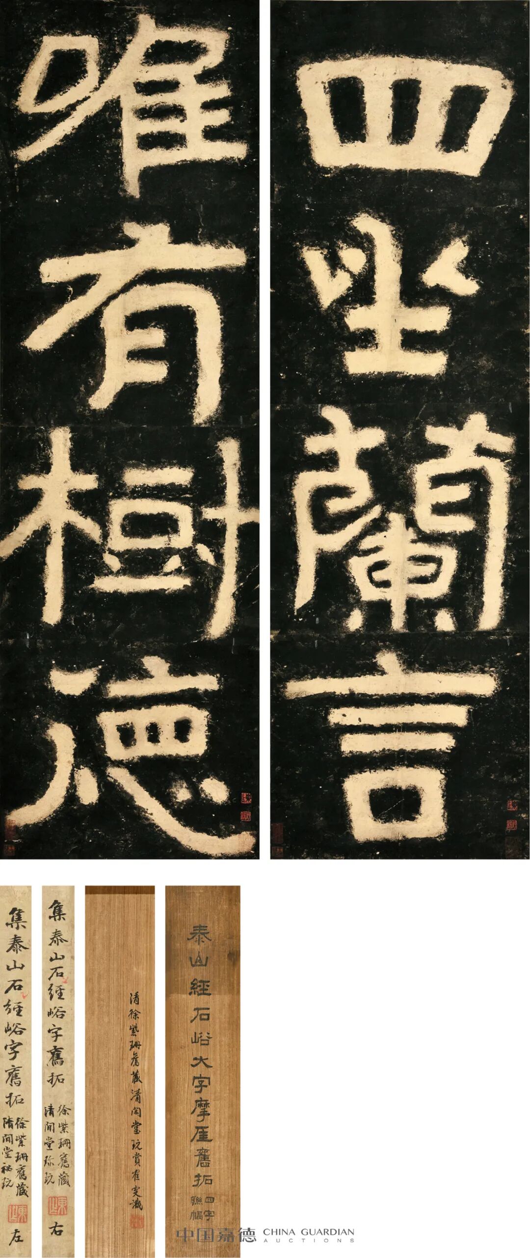 《泰山经石峪》是著名的摩崖刻石,隶书大字刻《金刚经》。书体在楷隶之间,偶有篆意草情,古拙朴茂,静谧安详,为历代书家所推崇,被冠以“大字鼻祖”“榜书之宗”的美称。清杨守敬说:“北齐《泰山经石峪》以径尺之大书,如作小楷,纡徐容与,绝无剑拔弩张之迹,擘窠大书,此为极则。”清人冯云鹏在《金石索》中盛赞:“如印泥画沙,草情篆韵,无所不备。”此对集联为所见同类物中之最旧者,墨色沉黝,经徐紫珊、日下部鸣鹤先后递藏。又曾为罗振玉、王国维等大家经眼。68.5×98.5 cm