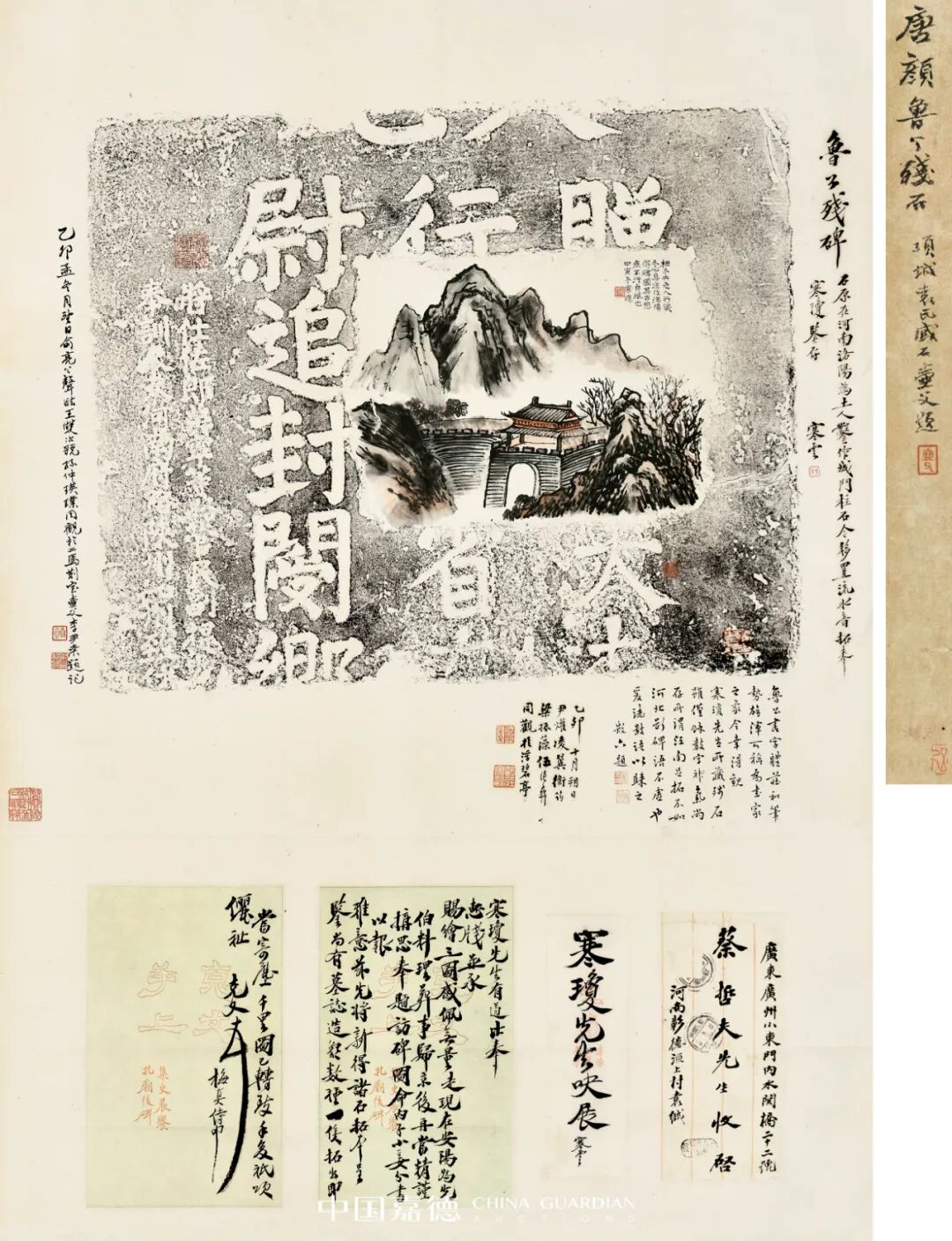 此件拓本据袁克文题识可知,残石原在河南洛阳,被当地人凿为城门柱石,后为袁克文所得,被安置于他在中南海的住处“流水音”。袁世凯及其家人是1913年春正式迁入中南海“总统府”,此件拓本的捶拓时间应该就是1913年间。颜鲁公残石存字虽仅余数字,但气势尚存。蔡哲夫得此拓本后极为喜爱,在残缺处作“洛阳得碑图”一幅,妙趣天成。和拓本相附的,还有袁克文致蔡哲夫的一封书信,书信当写于蔡哲夫“洛阳得碑图”完成之后,想来蔡哲夫画完“洛阳得碑图”后,定是邀请袁克文再作“洛阳访碑图”,故袁克文信中有“归京后再当精谨构思奉题访碑图”之语。这批金石小品系出名门,来源有绪,数十位名家、上百则题藏考释信息见证金石学者的交游与文物流散史。释达受、翁方纲、桂馥、吴昌硕、端方、陈介祺、吴大澂、潘祖荫、赵之琛、褚德彝、邹安、张廷济、陈梦家、姚华、吴湖帆……涵盖清至民国时期金石学家、收藏家,他们或题签、或题识、或观款、或跋语,题藏内容涉及文字考释、器物和拓本的流传情况及晚清以后的文人交游、文物流散史等等,是不可多得的珍贵史料。名家题跋累累,钤章琳琅满目。1框纸本