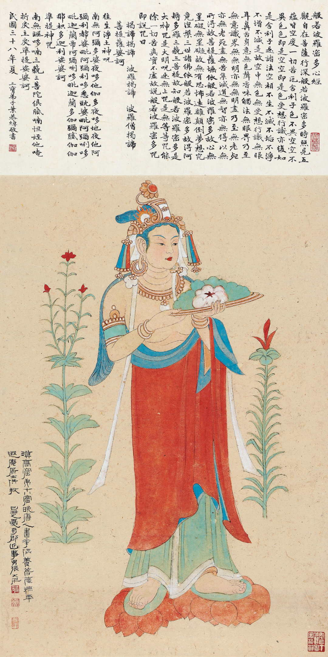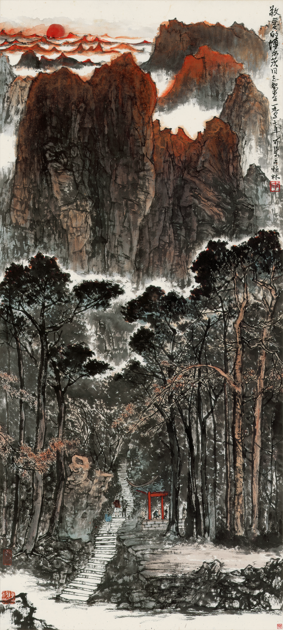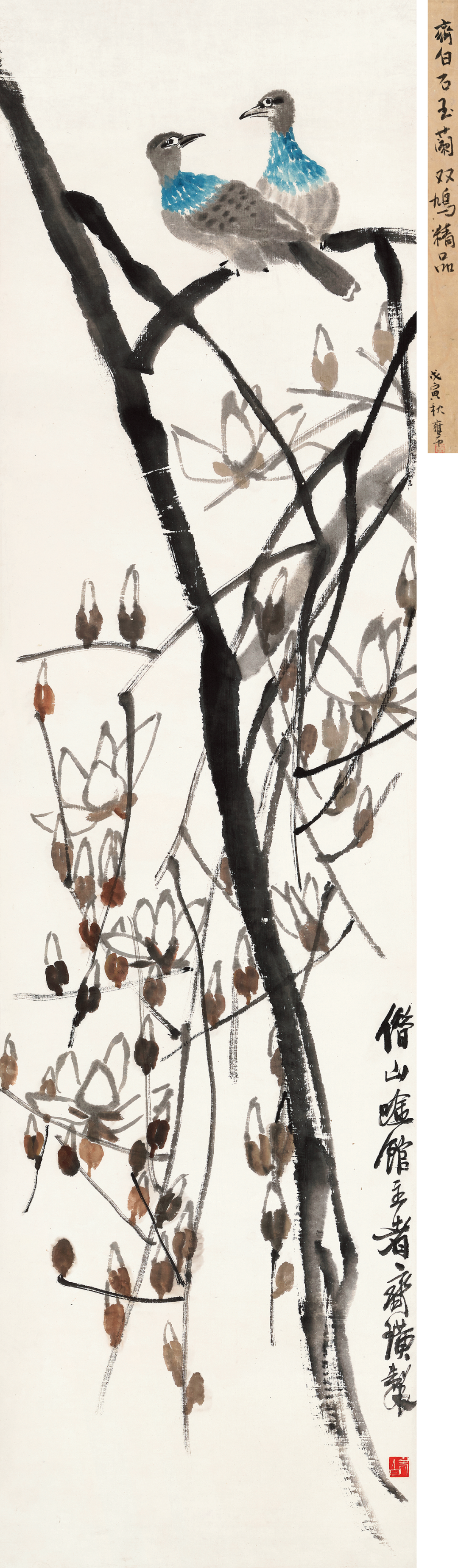 【题识】今日为时慧三十晋五生日,入蜀六载余,实未尝重视之也。忆与时慧结褵十有五年,大儿益钧十四岁,二儿益巨十岁,长女益珊六岁,次女益璇方九月,从俗称亦两岁。余以艰苦之身,避地东川,岳母李太夫人俱来,战时一切,均极激荡,而我辈仍不废笔墨丹青,所居仅足蔽风雨,所衣皆丁丑前之遗,真如大痴家无担石之储也。幸时慧忍受向所不能忍者。益珊之前,戊寅秋于湖南东安旅次生一女,卒以入蜀途中殇于四川綦江,时正重庆遭敌狂炸之翌日。嗣后连得珊、璇二女,哺育之苦,时慧任之,余之感纫为荷也。汝生儿育女后,方知父母之大德。顾余冥顽,听若无闻,今数人之父矣。际兹浊世,一切不堪。倘将来得有所传,皆非余所应有,盖莫非余母之所训,暨时慧之所助成也。乙酉五月十七日。重庆金刚坡下寄寓,并记敬意。时慧赏之,傅抱石。