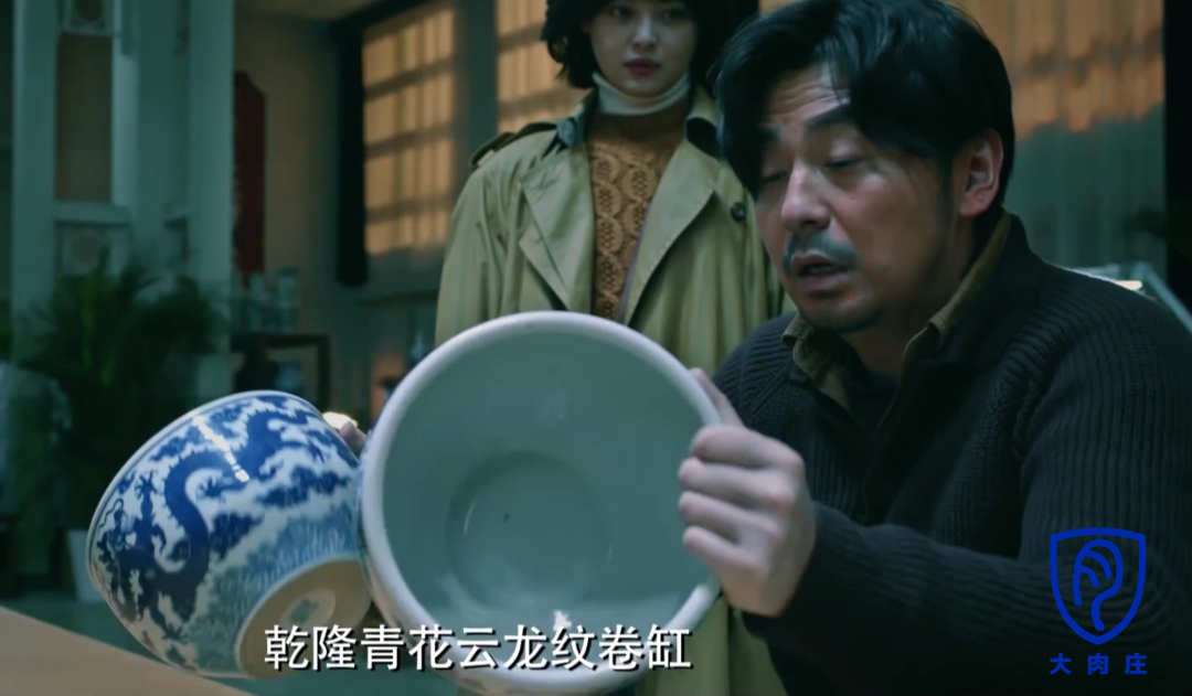 第四件不用猜,台词给了答案——清乾隆青花云龙纹卷缸。卷缸是文房清供的一种,也称“案头缸”,一般用来放卷轴书画类用具,图案纹饰多样,有龙纹、花鸟、人物、博古图等等。
