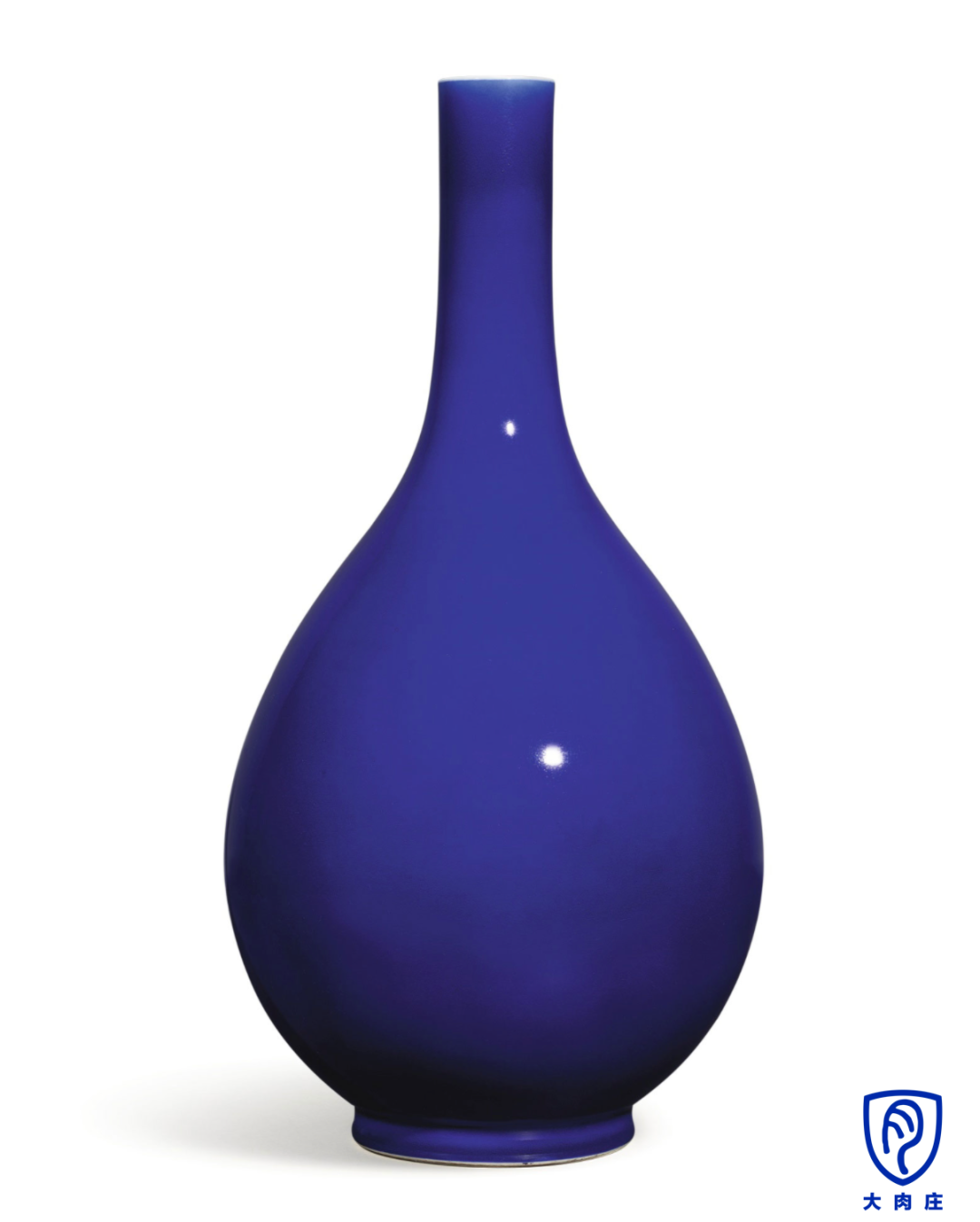 最后一件特写较多的是大件的霁蓝釉胆瓶。霁蓝釉是明清单色釉中特别珍贵的一种(虽然纯净的单色釉都挺贵重的),因为在祭祀中蓝色瓷器对应“天”,也被称为「祭蓝釉」。