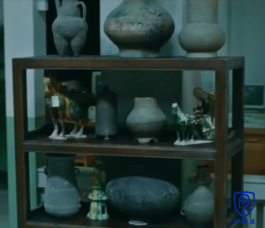 其他的还有一些做背景板的瓷器,一眼望过去信息量也很大的样子。比如上面这个架子上,主要是陶器。最上排的乳足罐子,像是鬲或盉;三彩器是经典的三彩马和三彩人物雕塑。