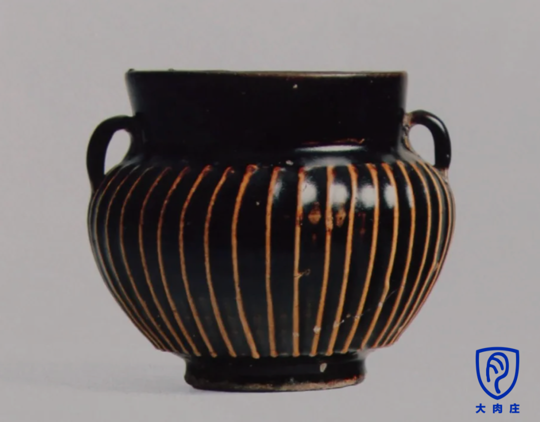 还有一秒扫过的这件黑地白色竖条纹的罐子。这种线条纹饰宋代北方窑口常见的装饰手法,叫「沥粉」。