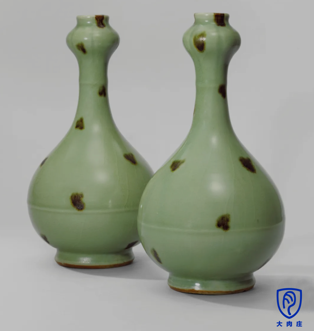 元龙泉窑飞青瓷褐瓣蒜头瓶一对