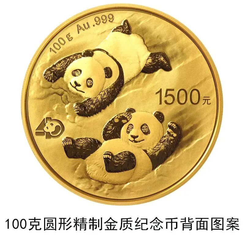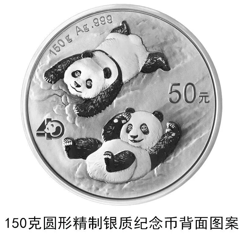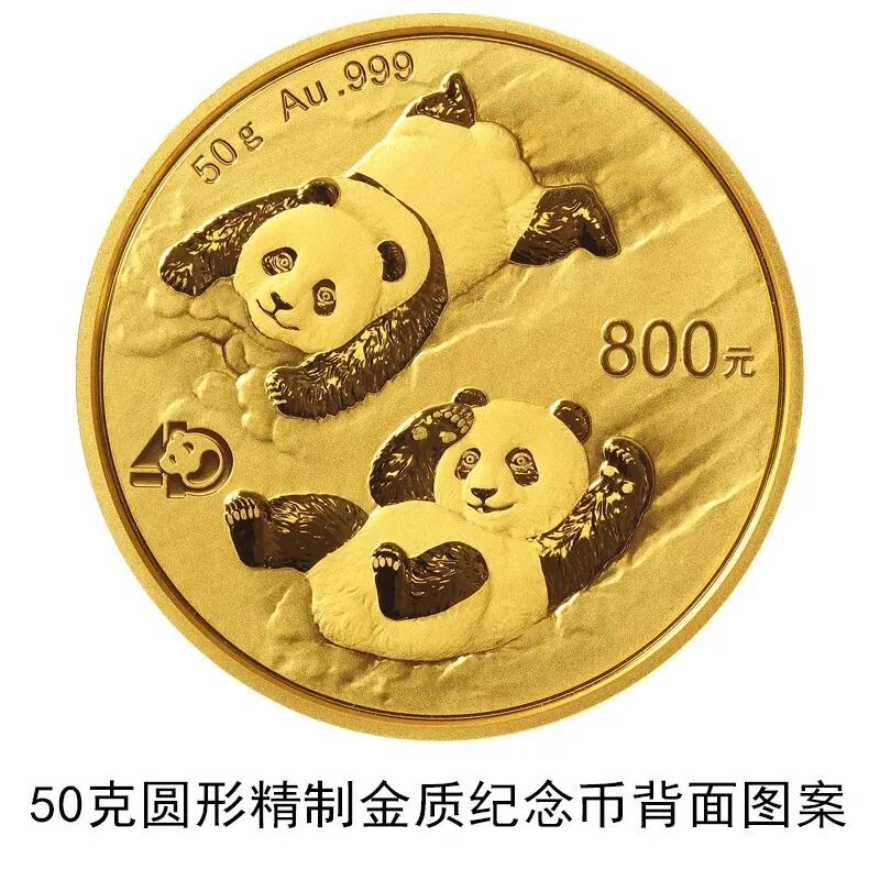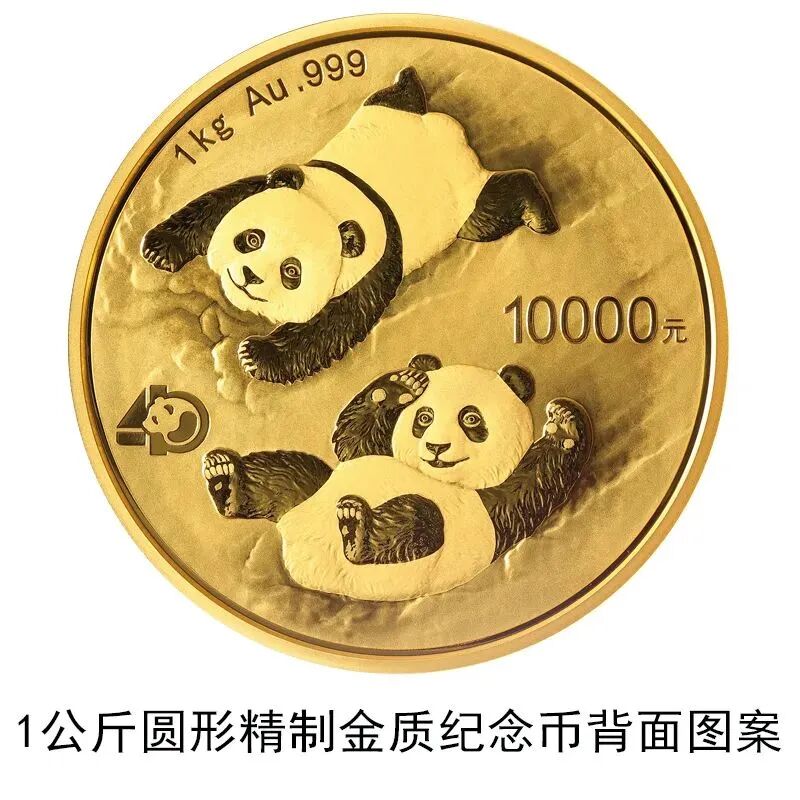 纪念币正面图案为北京天坛祈年殿,并刊国名、年号;背面图案为大熊猫滑雪嬉戏场景,辅以“熊猫金币发行40周年标识”元素,并刊面额、重量及成色。
