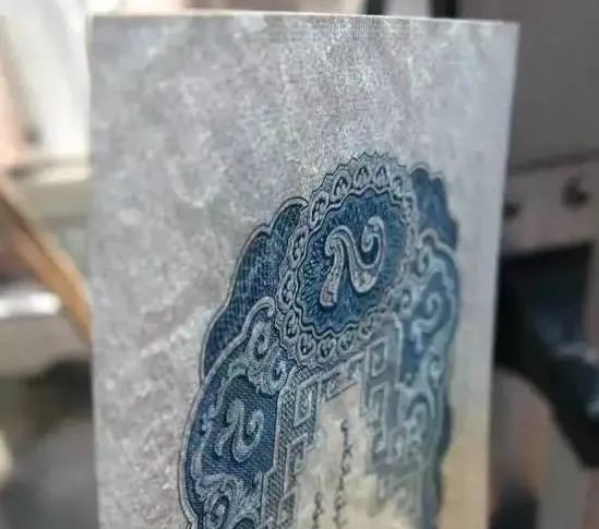 整形后的纸币,即便是从透视图中都无法看出端倪,仅是纸币表面的油墨稍稍失去一点光泽,整形前后对比,整形后纸币油墨的光泽度下降了。