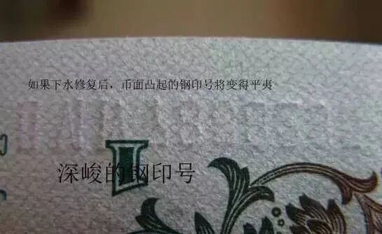 三版人民币中的背绿壹角版,此品种币面的油墨不太明显,但纸币的钢印有立体感,下水修复后币面钢印不再具有明显的立体感。