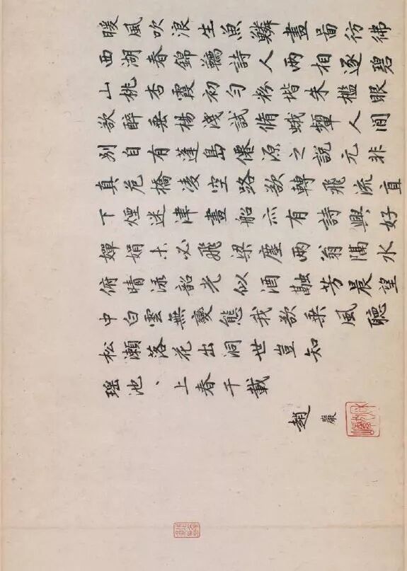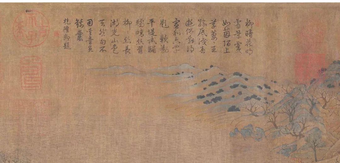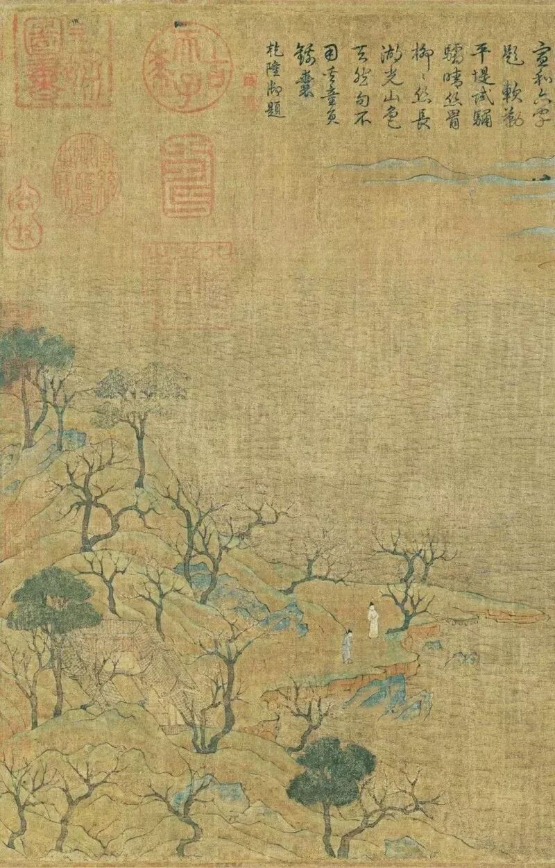乾隆对《展子虔游春图》喜爱有加,一次欣赏之余在古画左上部题诗:“柳暗花明雪景霁,如茵陌上草萋萋。王孙底识春游倦,敕得宣和六字题。软勒平堤试骕骦,晴丝古柳柳丝长。湖光山色天然句,不用金童负锦囊。”命将《游春图》收录于《石渠宝笈》。