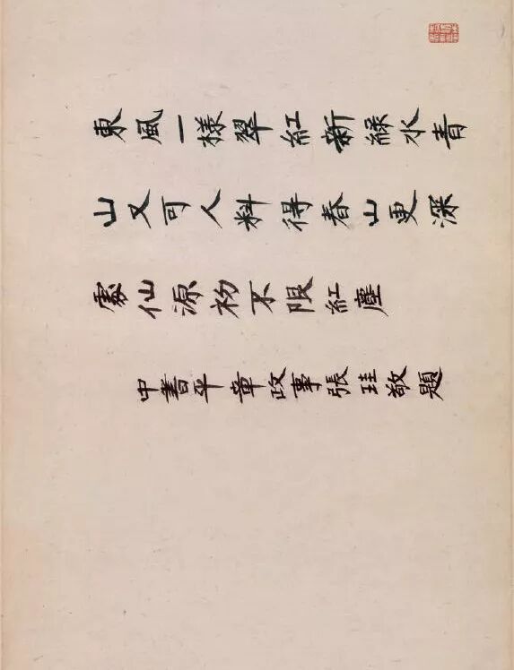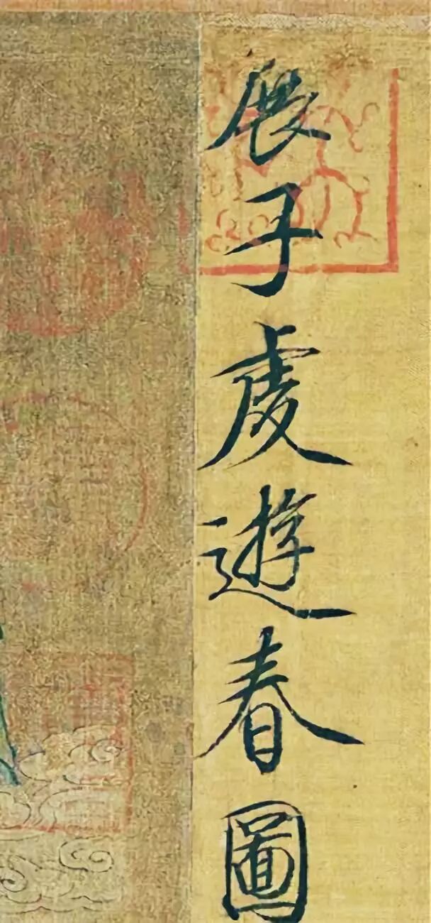 宋徽宗对《游春图》的喜爱,表现在画卷首的隔水处,亲自题写的“展子虔游春图”六个瘦金字,笔势劲逸,意度天成,有如皇帝钦点状元卷,起到了画龙点睛之效。