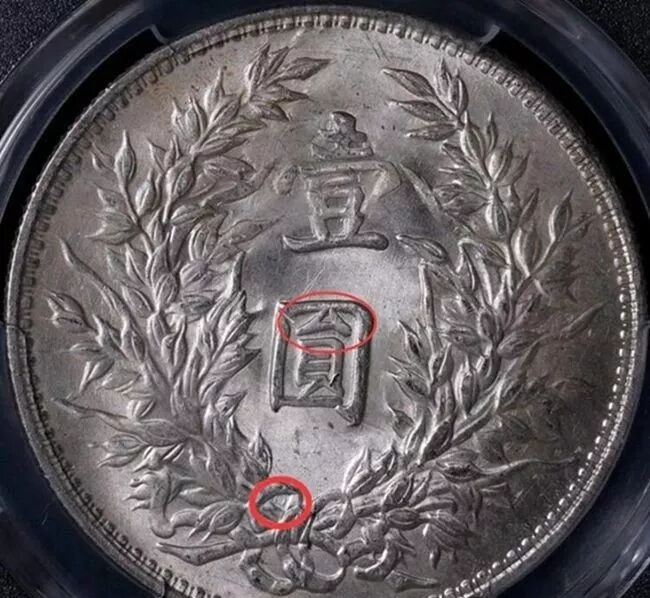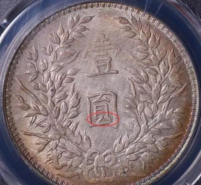 小编总结一下甘肃版的基本特征,又称为“开口贝版”,该币正面袁像肩章条纹明显,五角星显平直,背面嘉禾中间铸造的壹圆二字的“圆”内贝字最下一横未与竖笔连接,其嘉禾叶、穗粗壮饱满,另外,袁像眼中有一从上至下的极短直线,俗称“睁眼”。