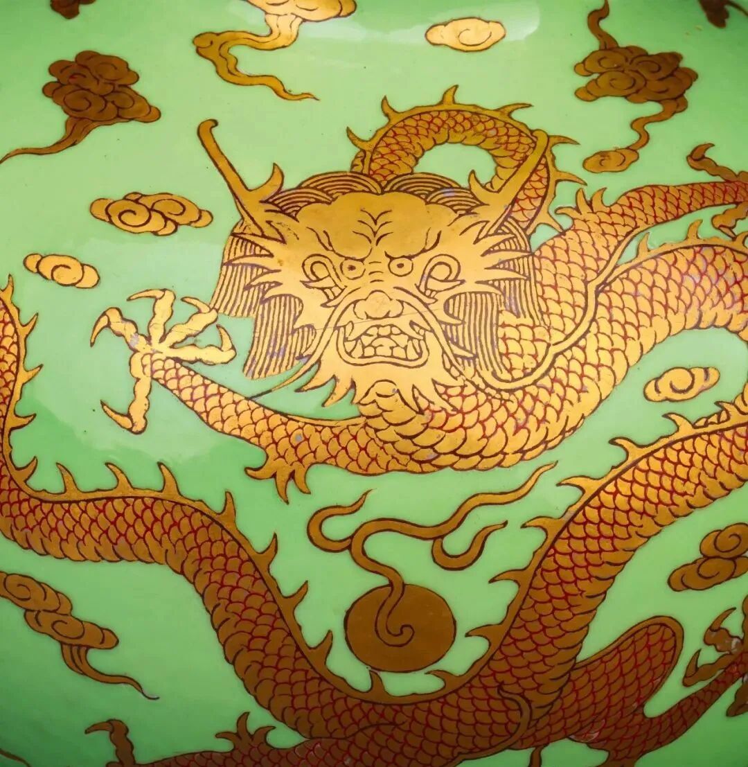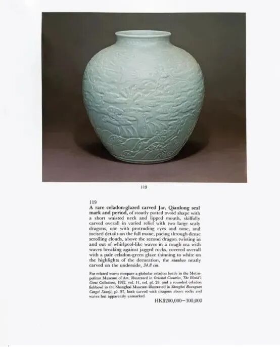 本罐体形硕大,釉色莹润均匀,浮雕工艺超卓,器身通体凸饰苍龙教子纹,寄予弘历对继任人传承盛清的厚望,为清乾隆高宗一朝单色釉作品中颠峰之作。英国威尔特群放山居Alfred Morrison、东京出光美术馆旧藏曾有一罐与本品极为相似,后售于香港苏富比,2014年10月8日,编号3901,以高价9420万港币成交。